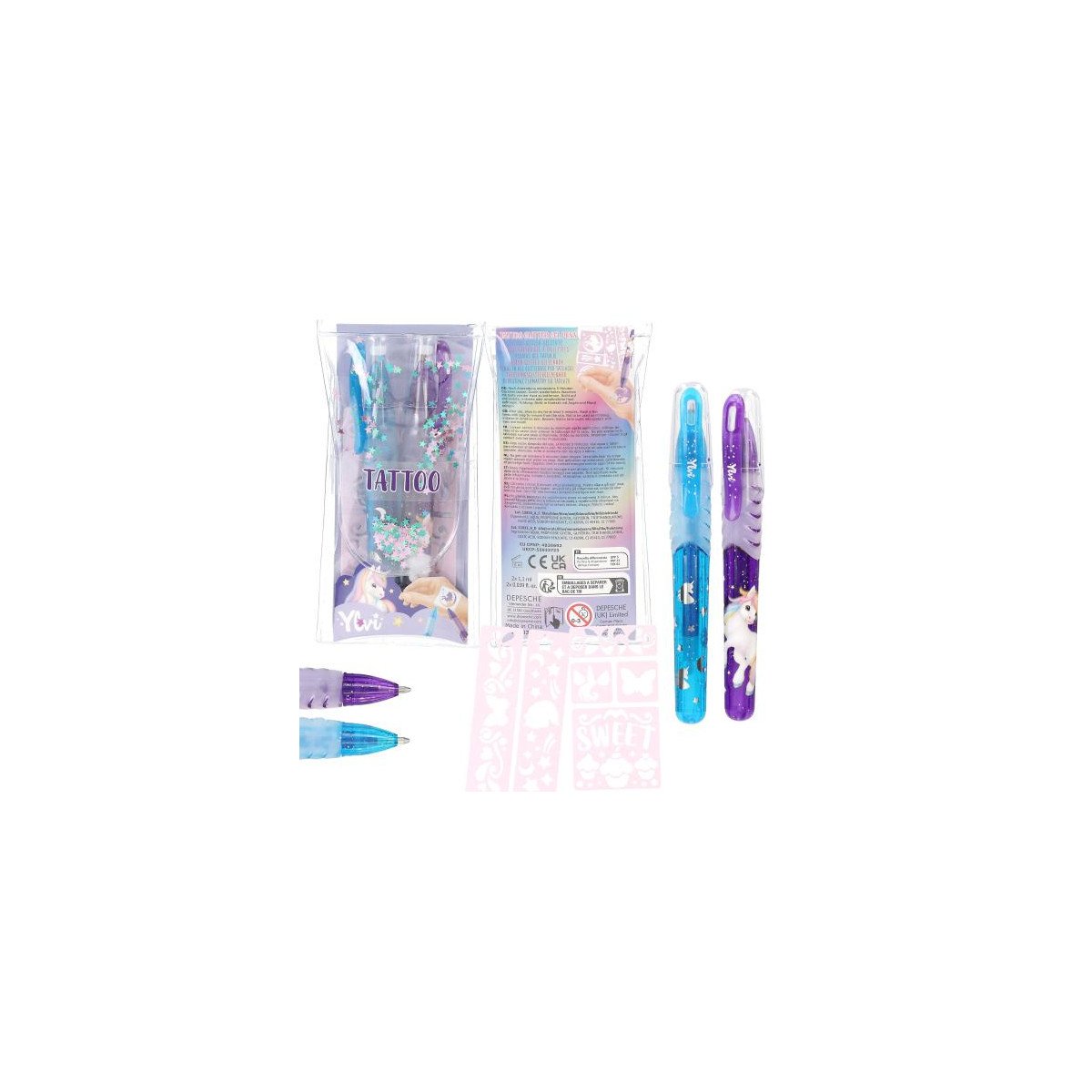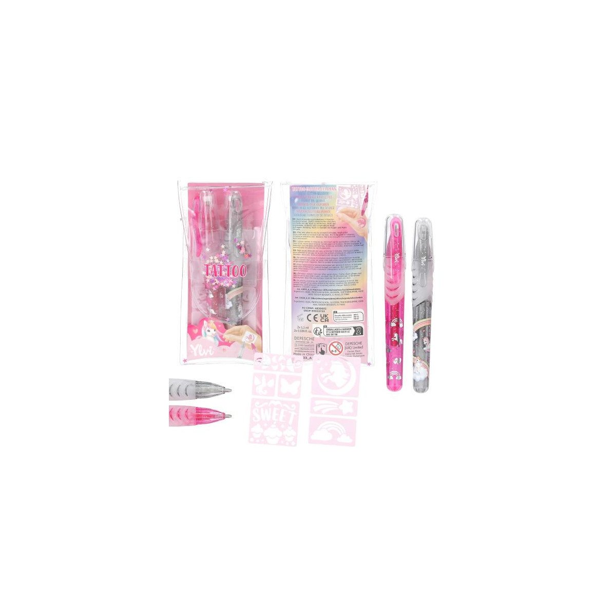 Con los Bolígrafos de Gel Purpurina Ylvi podrás transformar tu piel en una obra de arte temporal. Este set está diseñado especialmente para crear tatuajes brillantes y decorativos directamente sobre el cuerpo, sin necesidad de tinta permanente ni complicaciones. Incluye 2 rotuladores disponibles en 2 modelos diferentes (rosa y gris o azul y lila) y plantillas adhesivas que se pueden reutilizar.