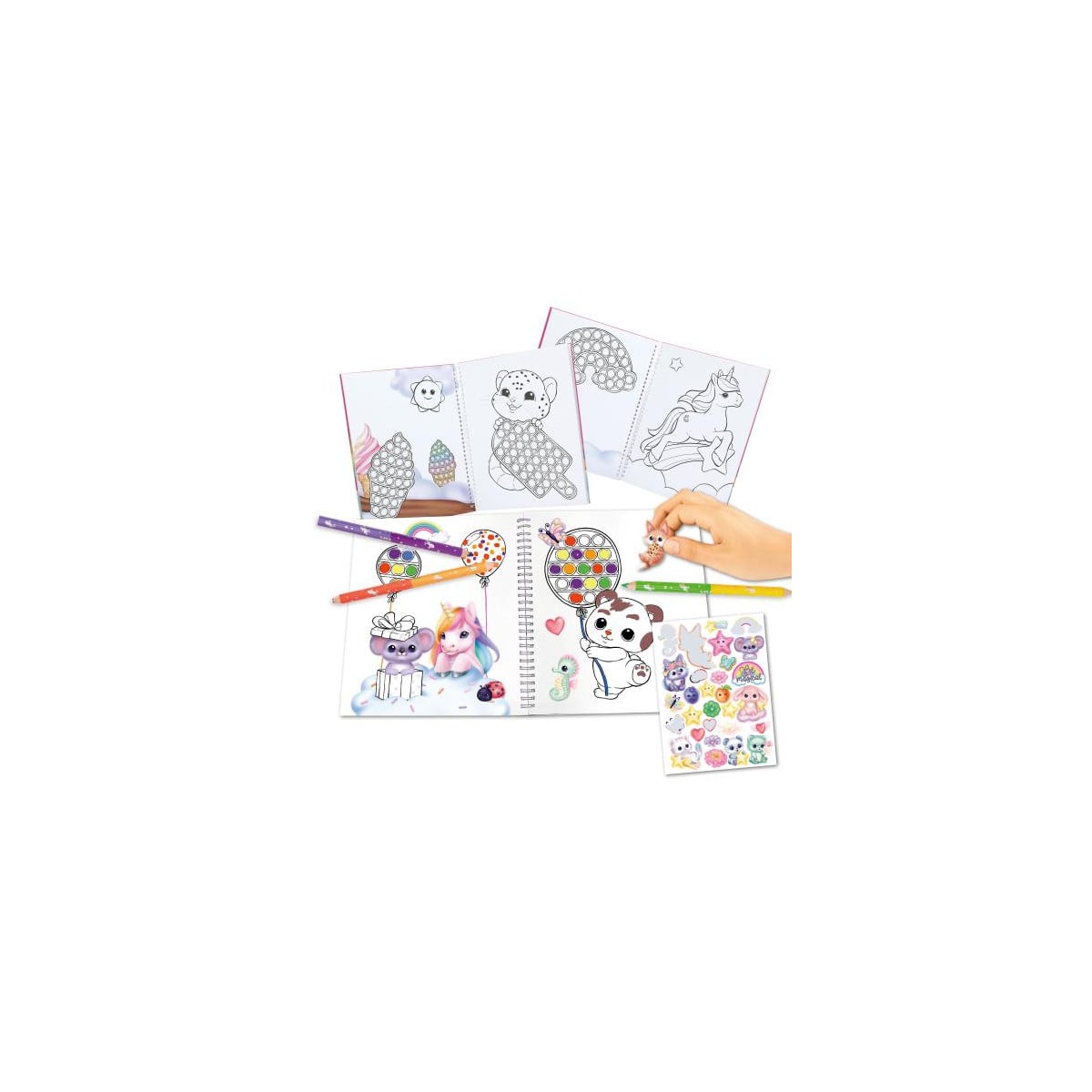 Este completo cuaderno incluye ilustraciones para colorear, pegatinas y un elemento sensorial tipo “pop” en la portada, que lo hace aún más divertido y diferente. Es perfecto para entretenerse mientras desarrollan la imaginación y la creatividad.