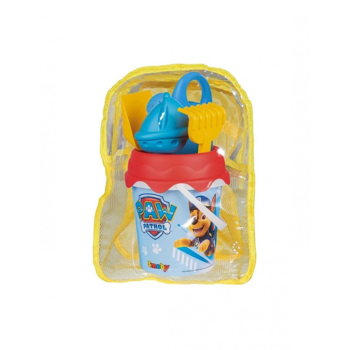 - Incluye: mochila de plástico transparente, cubo, tamiz, pala, rastrillo, molde para hacer formas en la arena y regadera.