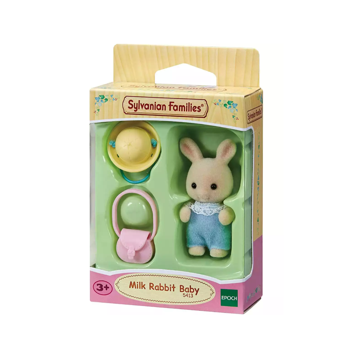 La figura de Bebé Conejo de Leche de la marca Sylvanian Families con mochila y sombrero. Personaje perfecto para ampliar tu colección y crear nuevas historias.