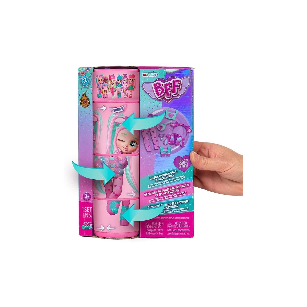 Bruny, de Bebés Llorones BFF, es una muñeca articulada con pelo largo y ojos de cristal. Incluye ropa, accesorios y sorpresas, ideal para mayores de 3 años.