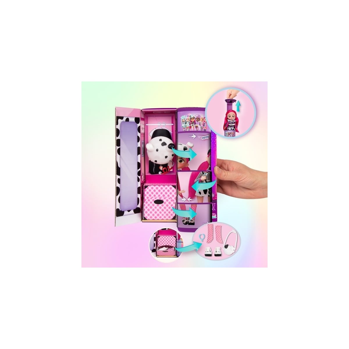 Para descubrir a Dotty tendrás que girar el cilindro que se encuentra dentro de la caja. ¡También hay 7 sorpresas con las que podrás completar su look!