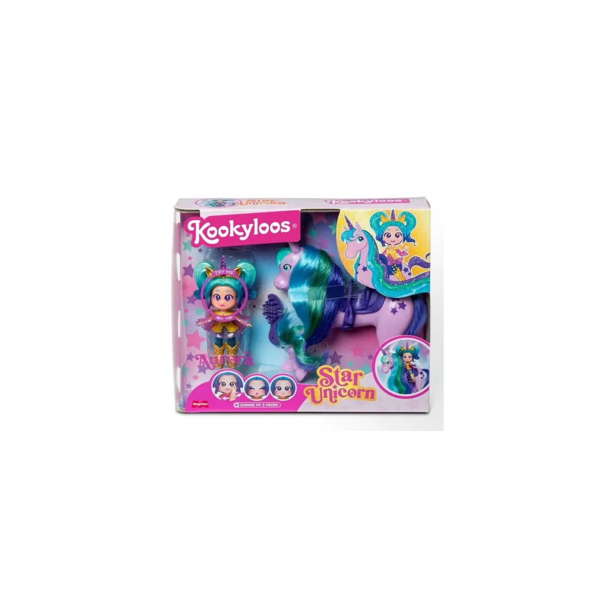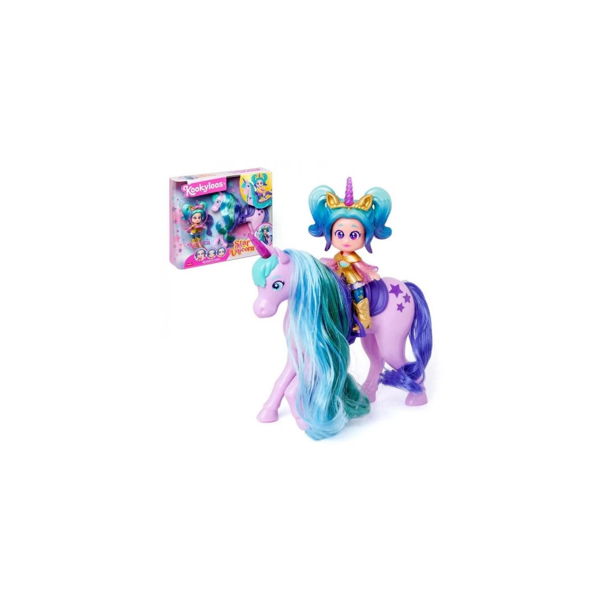 El set incluye una muñeca, un unicornio, un cepillo y un outfit, todo lo que necesitas para empezar a disfrutar de la magia de las KookyLoos.