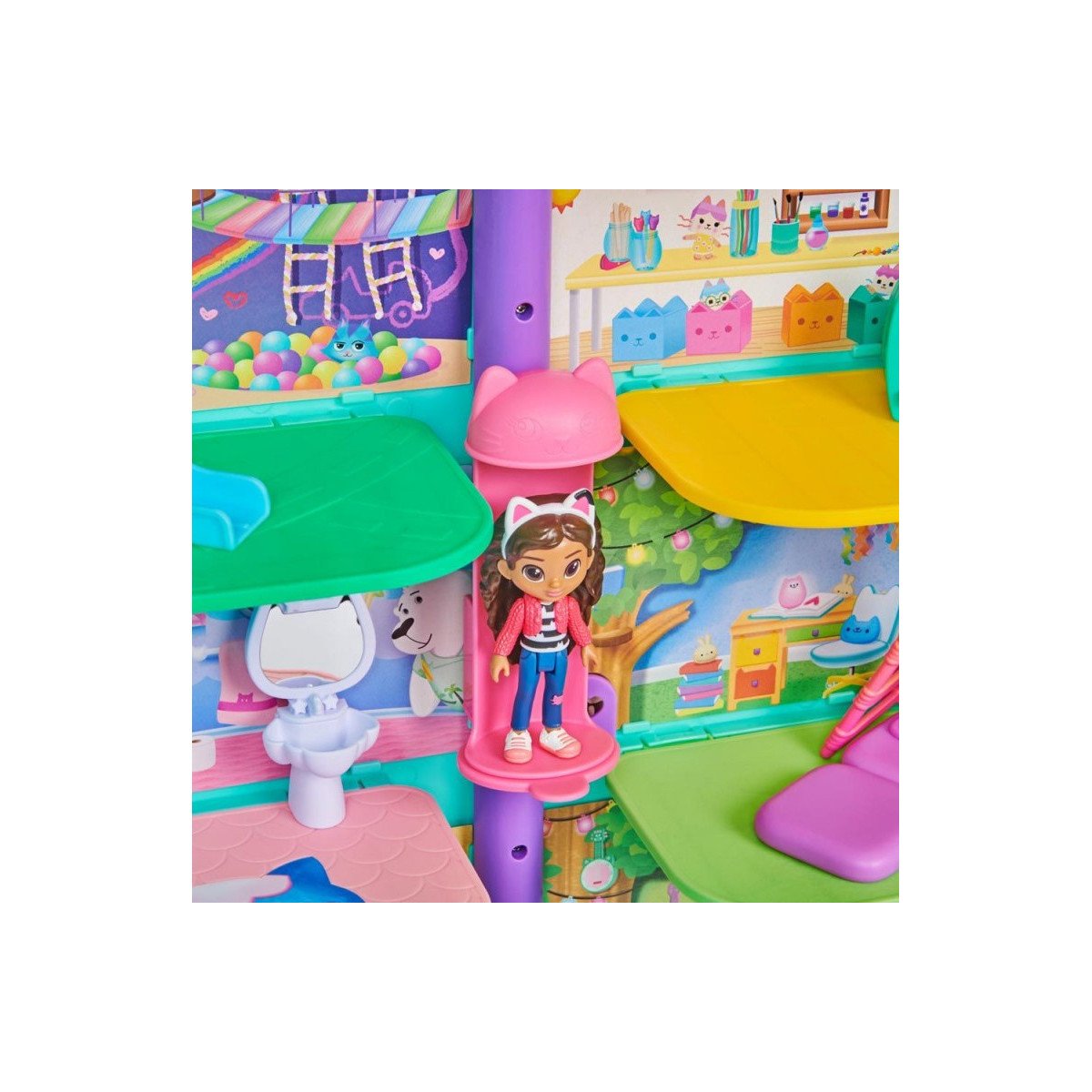 La Casa De Muñecas De Gabby con forma de gato es una casa de ensueño con 3 pisos donde podrás vivir aventuras increíbles cada día.
