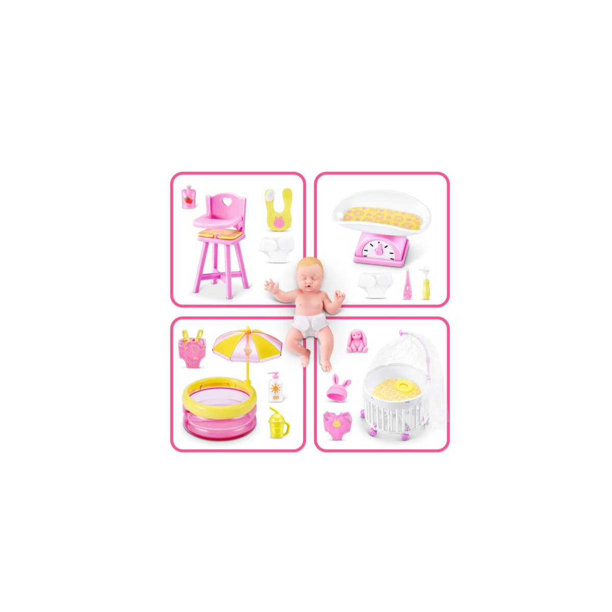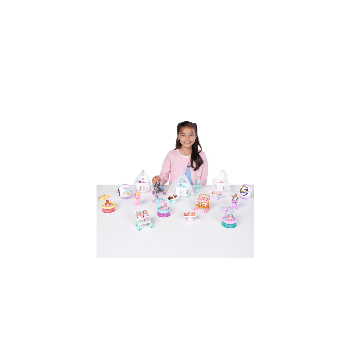 Los modelos son surtidos y se elige uno al azar al enviar, lo que convierte cada apertura en una aventura emocionante: es como crear tu propia guardería mini. Hay más de 15 bebés diferentes por descubrir, cada uno con un mini juego temático —hora de comer, cambio de pañales, paseo en carrito, piscina— junto a piezas a juego como biberón, sombrilla, trona o cuna mini, según el modelo.