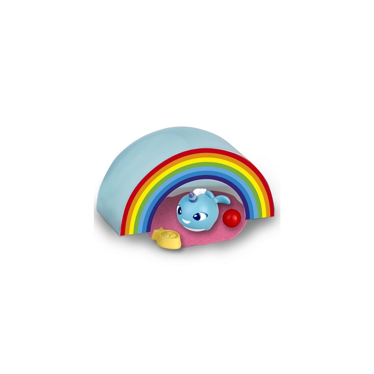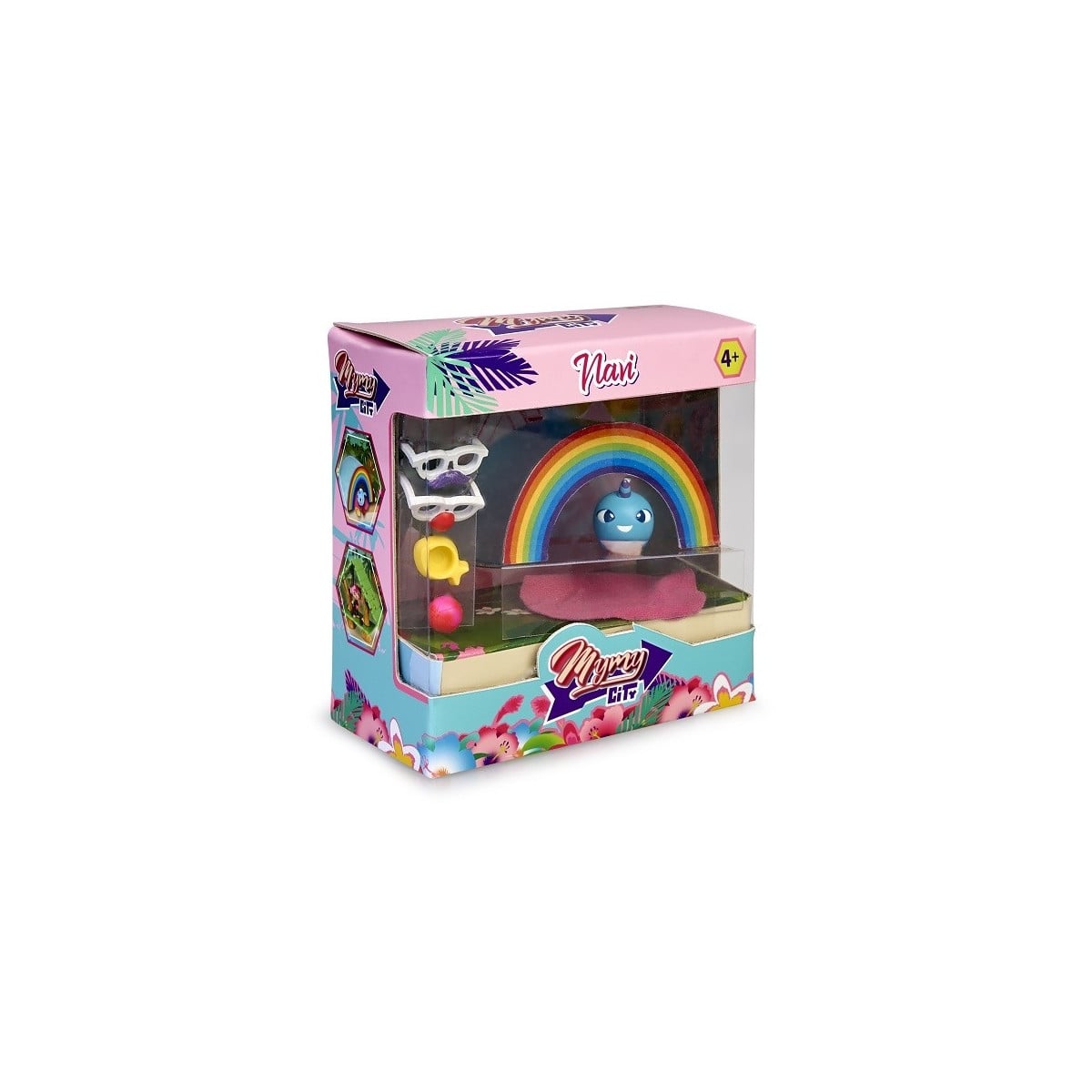 Entre sus accesorios cuenta con unas divertidas gafas de sol con narices, un bebedero para refrescarse, una pelota para jugar con sus nuevos amigos y una mantita para taparse por la noche.