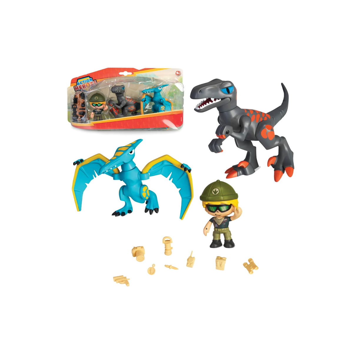 - Incluye: 1 figura Action Hero Pinypon, 1 figura de dinosaurio y accesorios temáticos para el juego.