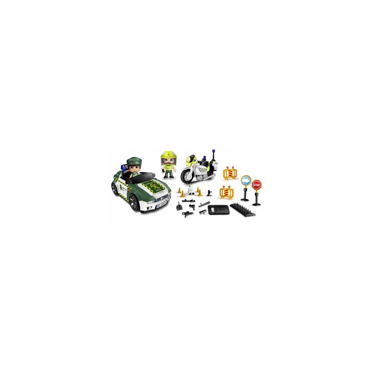 El set incluye un coche de la Guardia Civil de Tráfico, una moto, dos figuras, vallas, porras, escudos y todo lo necesario para montar un control y que los malos no sean capaz de escaparse.