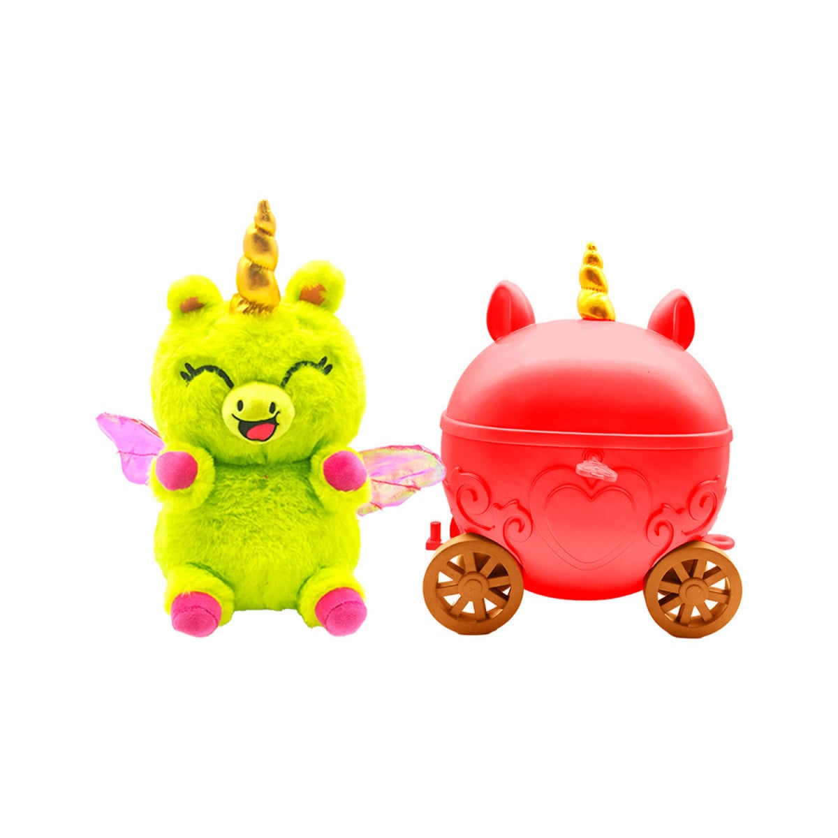 En su interior se esconde un adorable peluche sorpresa acompañado de pequeños accesorios, creando una experiencia de juego completa desde el primer instante. Abrir la carroza se convierte en parte del juego, ya que descubrir qué personaje contiene añade emoción y expectación.