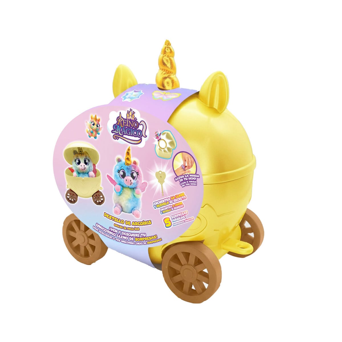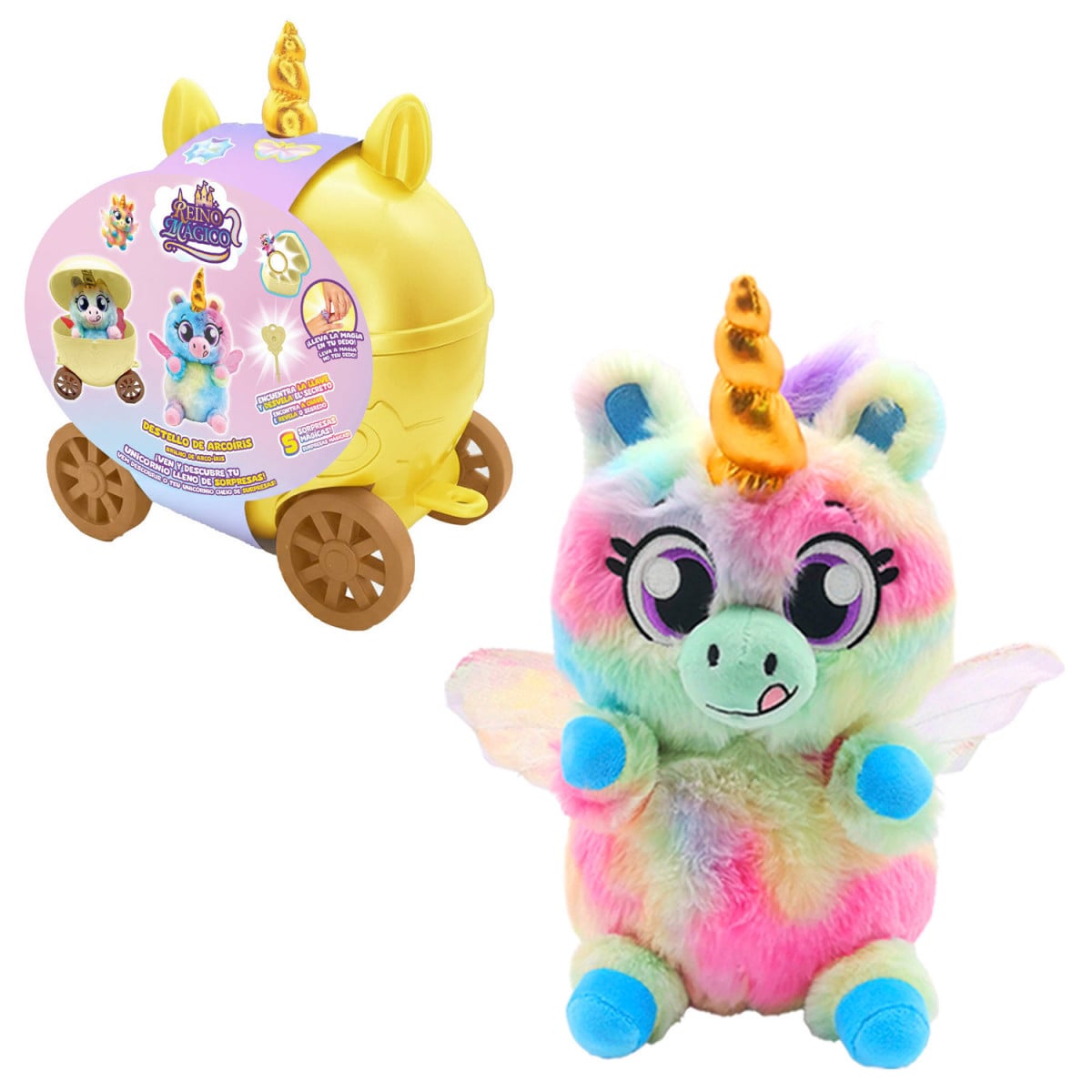 La carroza Reino Mágico con peluche sorpresa es un juguete lleno de magia que invita a los peques a sumergirse en un universo de fantasía y creatividad. Su diseño en forma de carroza encantada, con colores suaves y detalles brillantes, la convierte en un producto muy llamativo desde el primer momento.