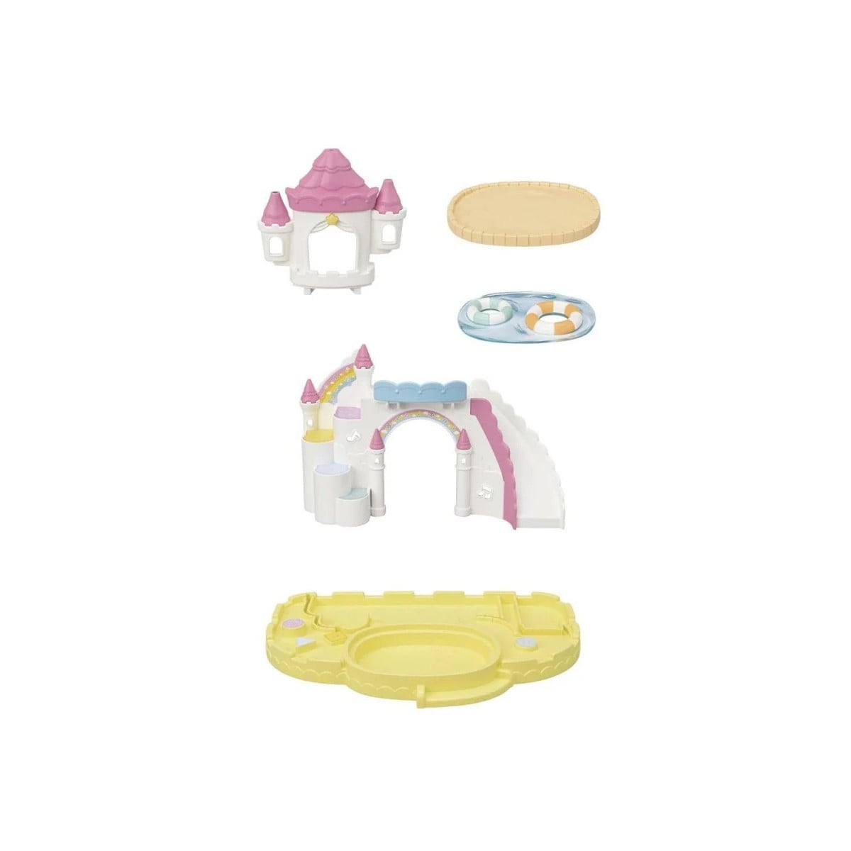 El set incluye: zona de castillo con piscina y flotadores, arenal, dos castillos de arena, 1 cubo, 1 pala, 1 pelota y 1 figura de bebé trillizo.