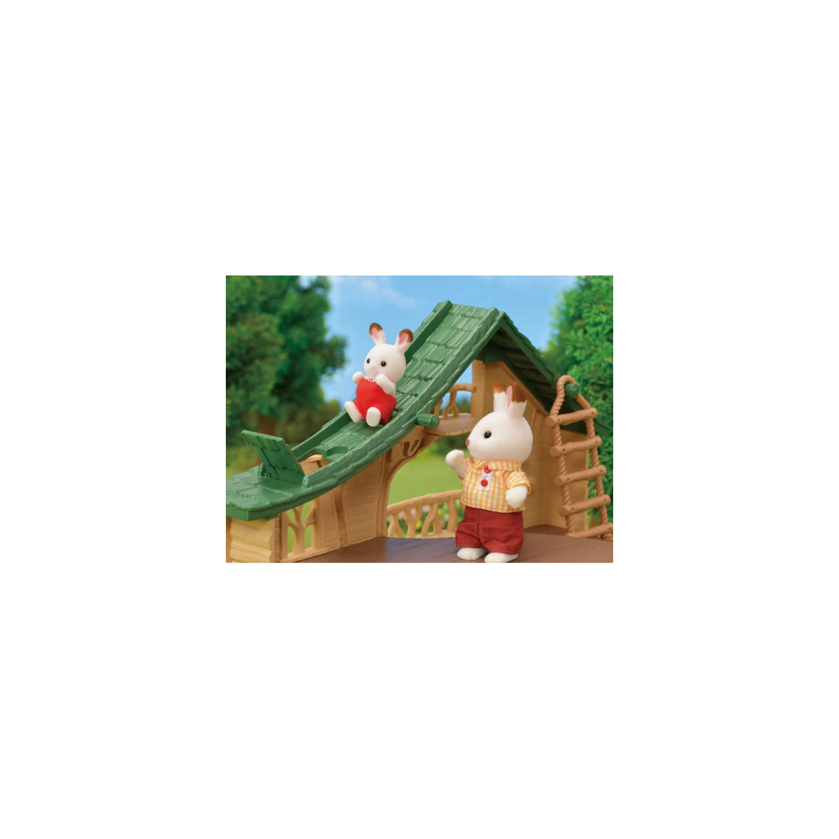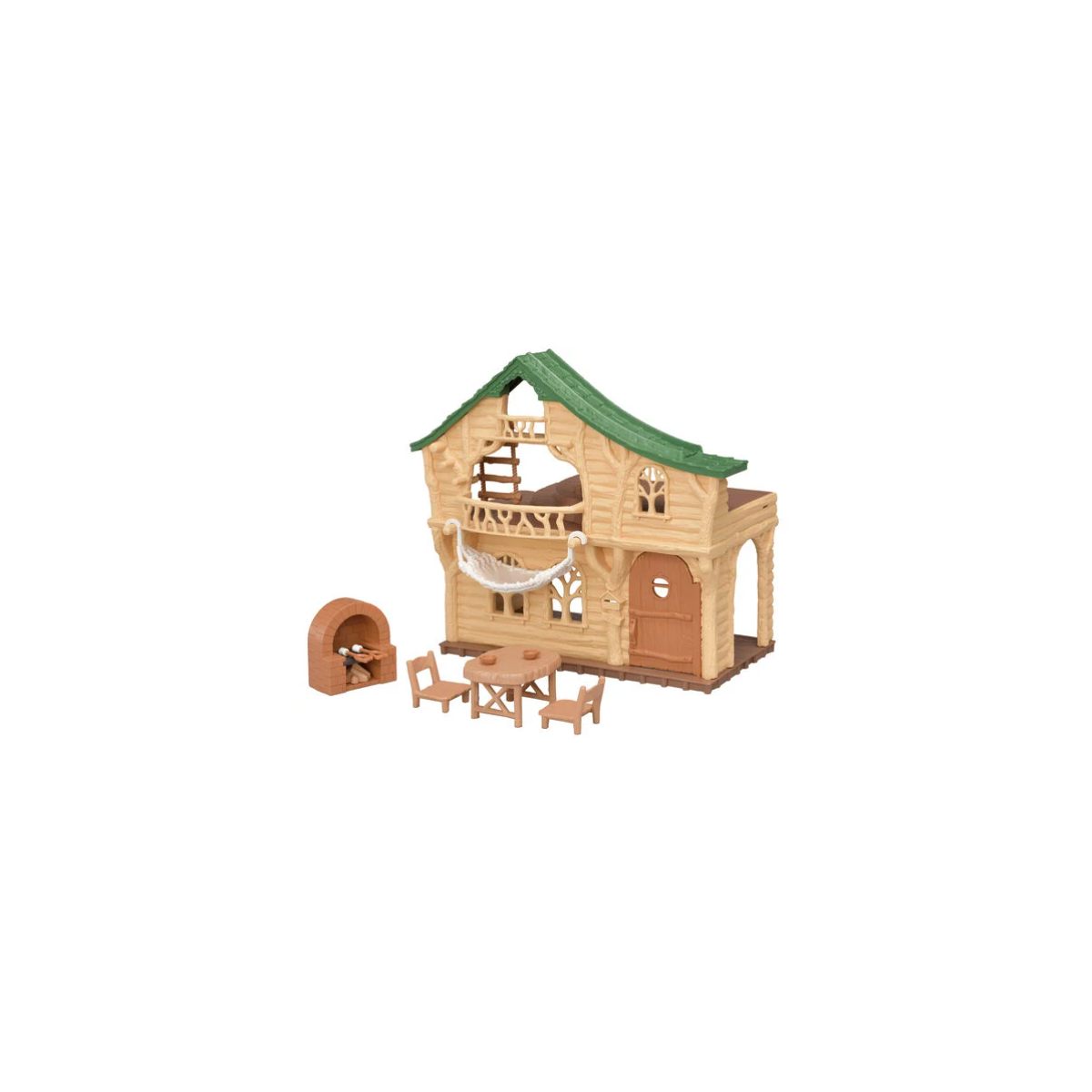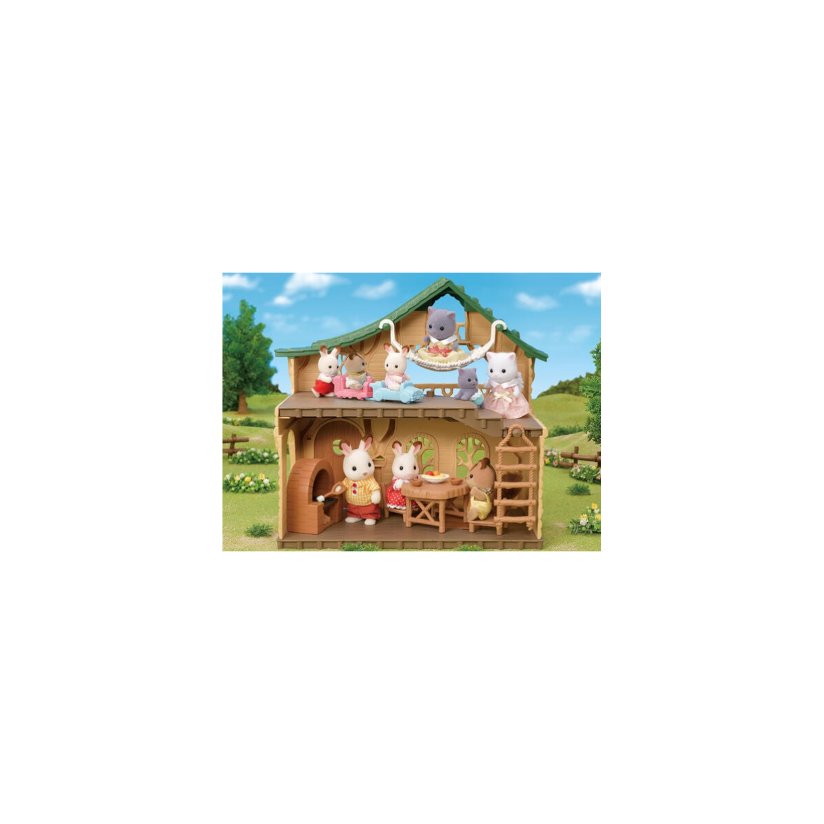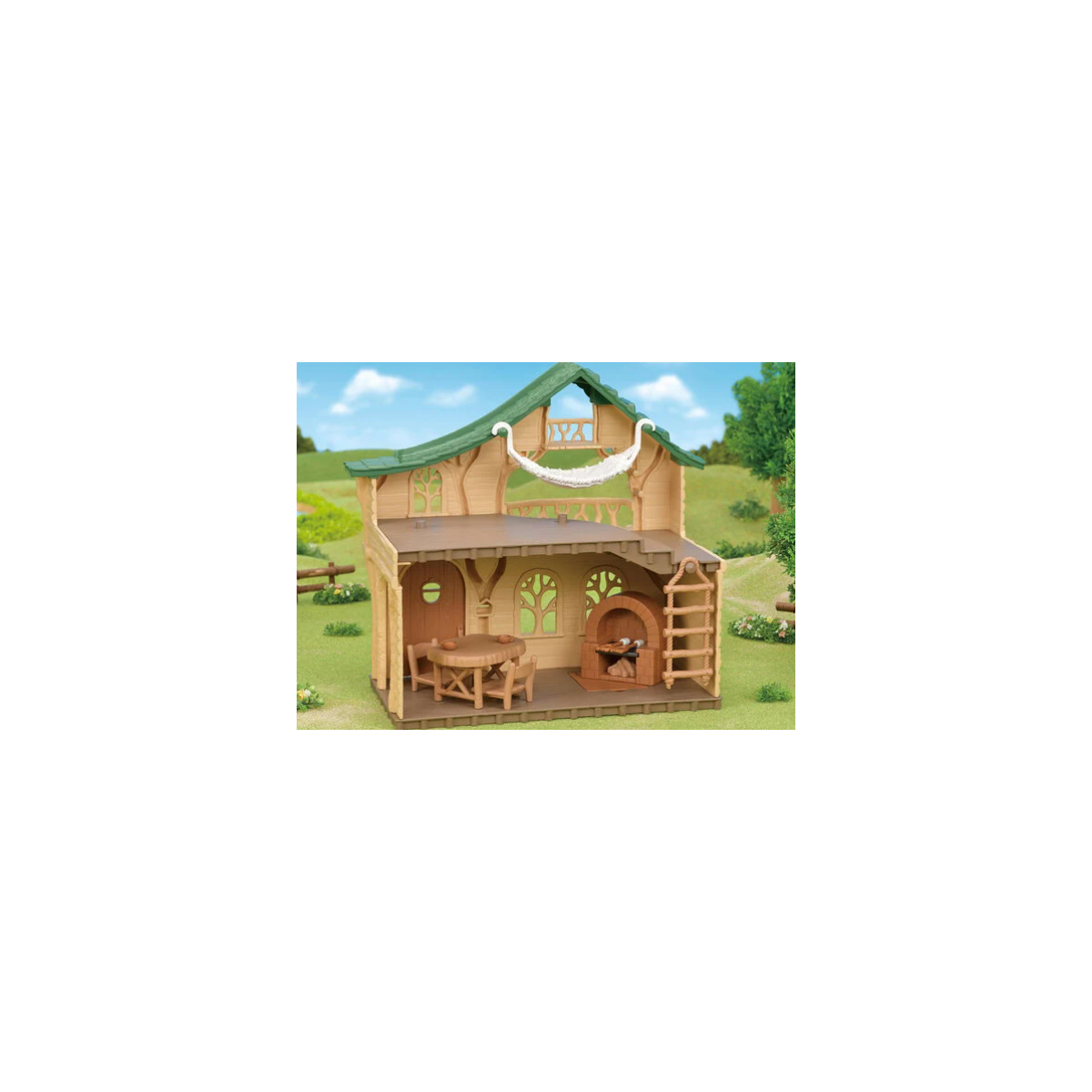 La cabaña cuenta con una estructura abierta, escalera, terraza y espacio para dormir, además de múltiples detalles de madera y acabados cuidados que hacen que cada rincón tenga encanto propio. Su techo se puede usar como tobogán, añadiendo un extra de diversión al juego. Aunque no incluye figuras ni mobiliario, es totalmente compatible con cualquier personaje y accesorio de la colección Sylvanian Families.