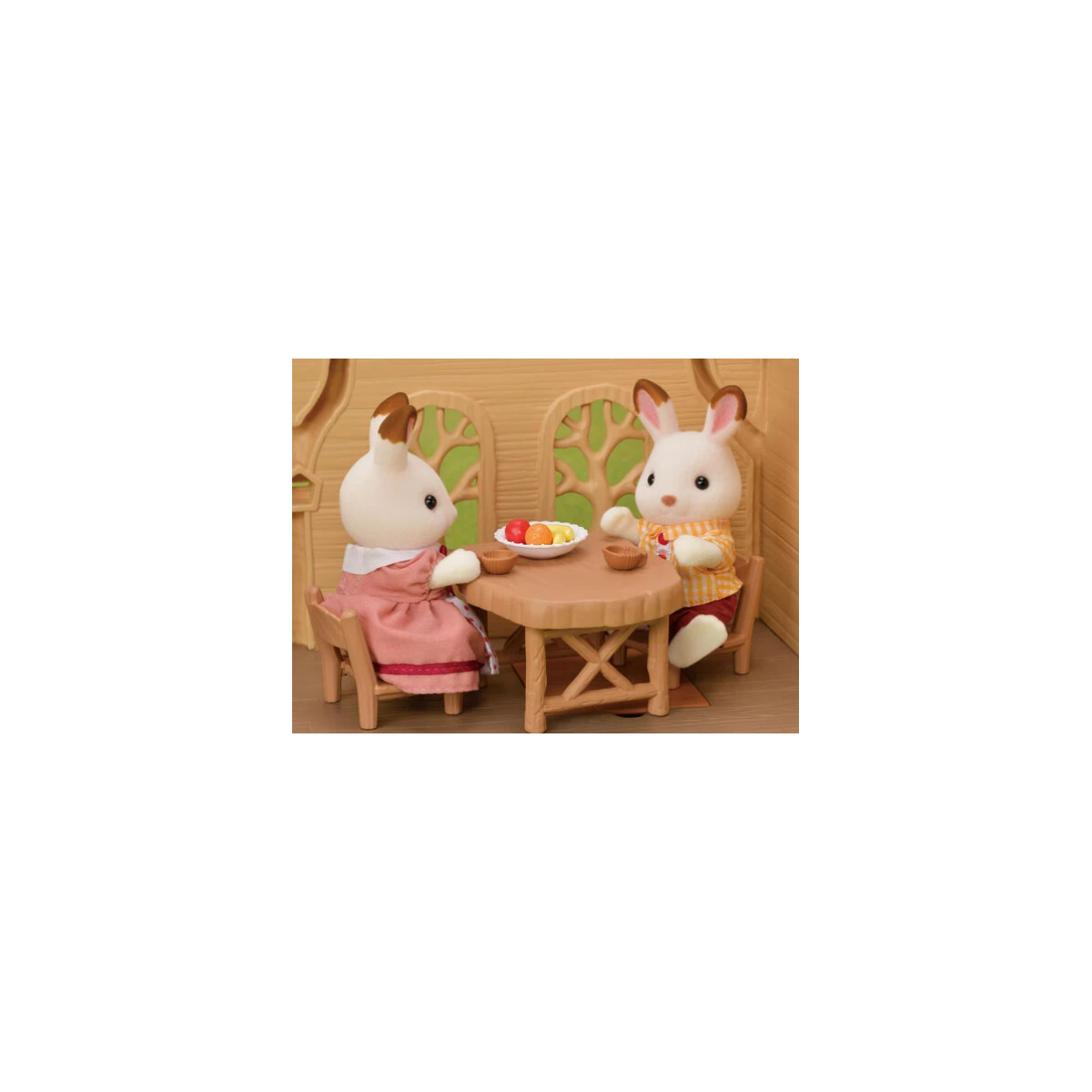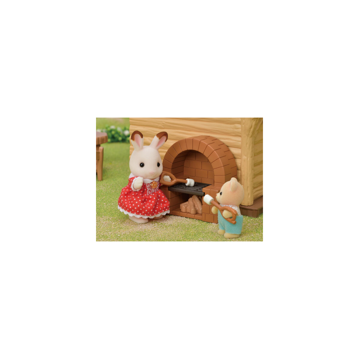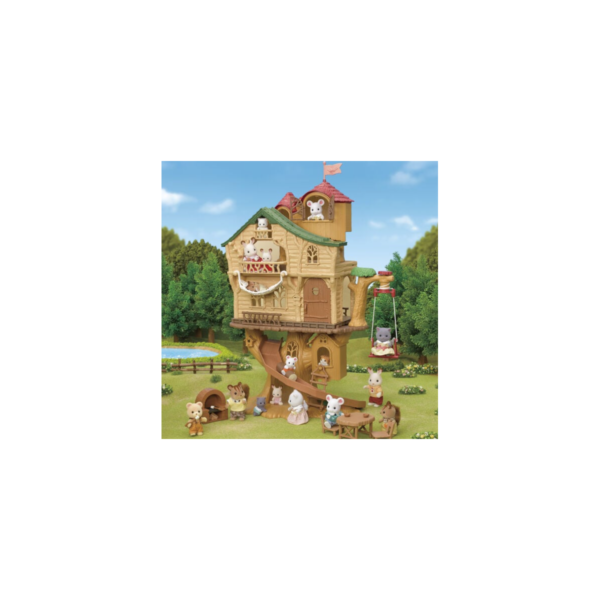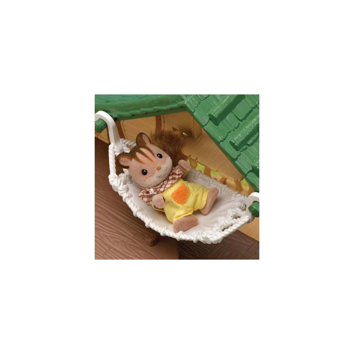 La cabaña cuenta con una estructura abierta, escalera, terraza y espacio para dormir, además de múltiples detalles de madera y acabados cuidados que hacen que cada rincón tenga encanto propio. Su techo se puede usar como tobogán, añadiendo un extra de diversión al juego. Aunque no incluye figuras ni mobiliario, es totalmente compatible con cualquier personaje y accesorio de la colección Sylvanian Families.