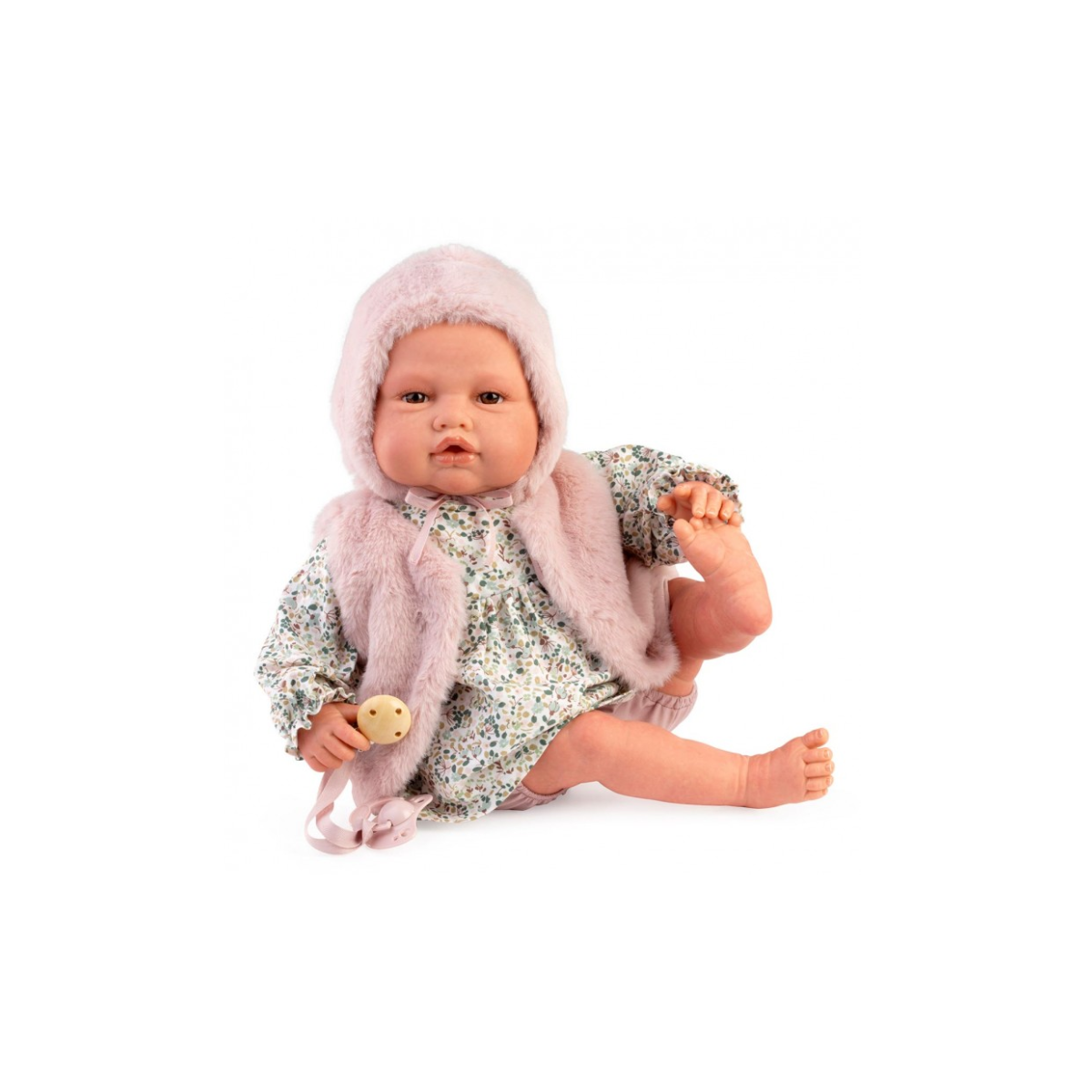 Va vestida con un conjunto moderno y cálido, que incluye un chaleco de pelo suave, ropa de punto y gorrito a juego. También incluye un chupete con cadenita y una mantita envolvente, para que el juego sea aún más completo. Todos los accesorios están pensados para enriquecer el juego simbólico y reforzar el vínculo con esta muñeca tan especial.