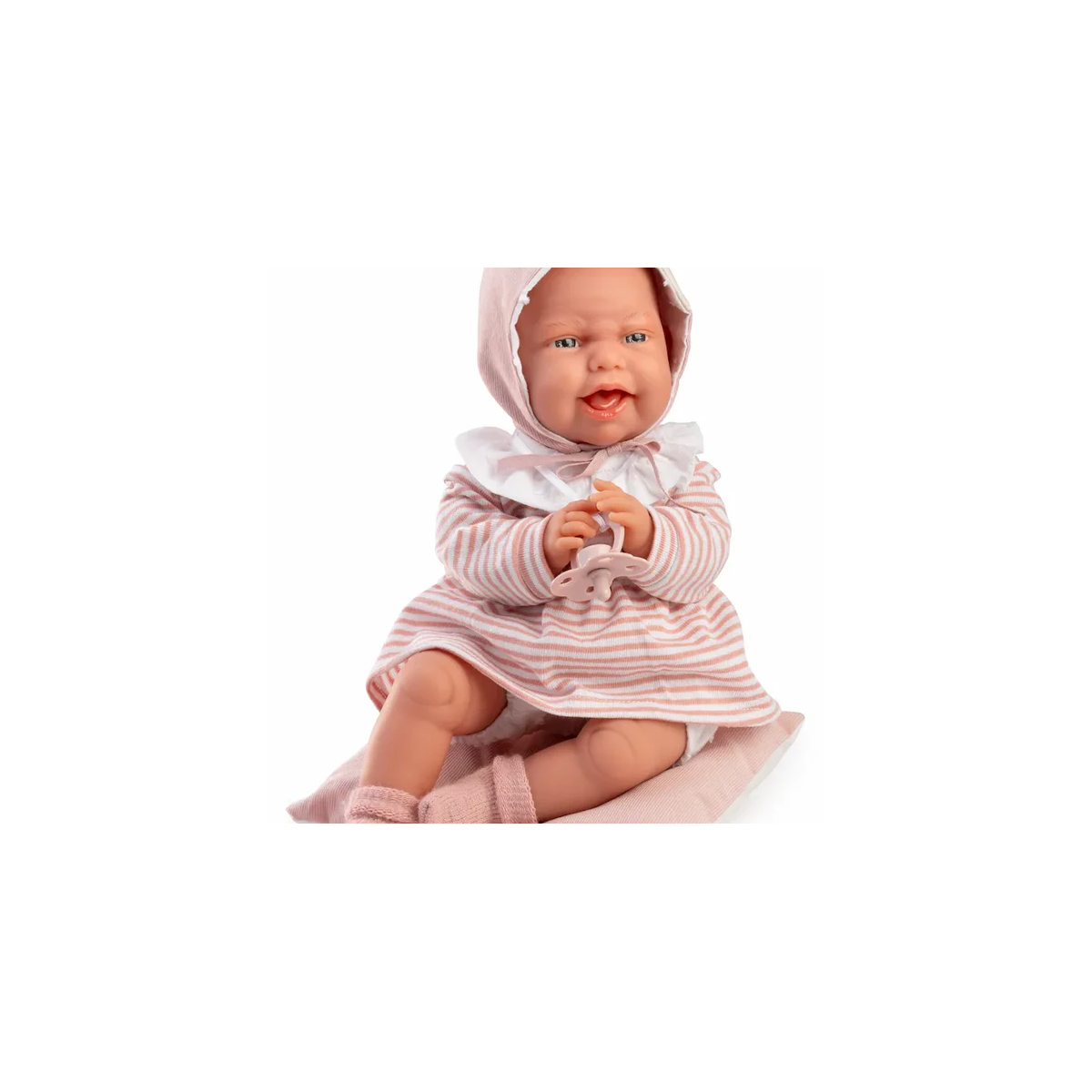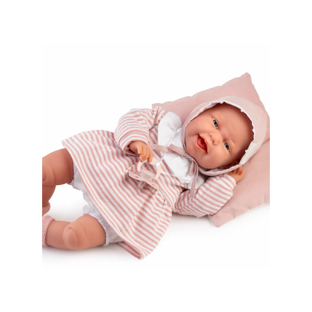La muñeca Clara Balbuceo Con Vestido de 34 cm es una opción encantadora que combina ternura y un toque interactivo para hacer el juego aún más especial. Su expresión dulce y su tamaño manejable la convierten en una compañera perfecta para acompañar a los peques en sus momentos de juego, cuidado y aprendizaje.
