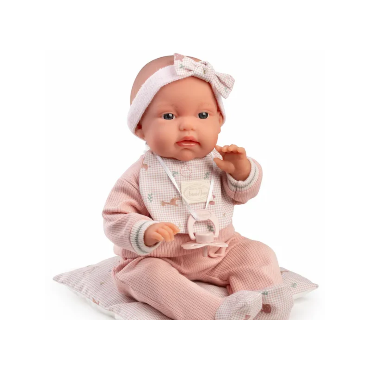 - Incluye accesorios: Pijama, babero, diadema con lazo, chupete y cojín, permitiendo recrear distintas situaciones de cuidado y descanso.
