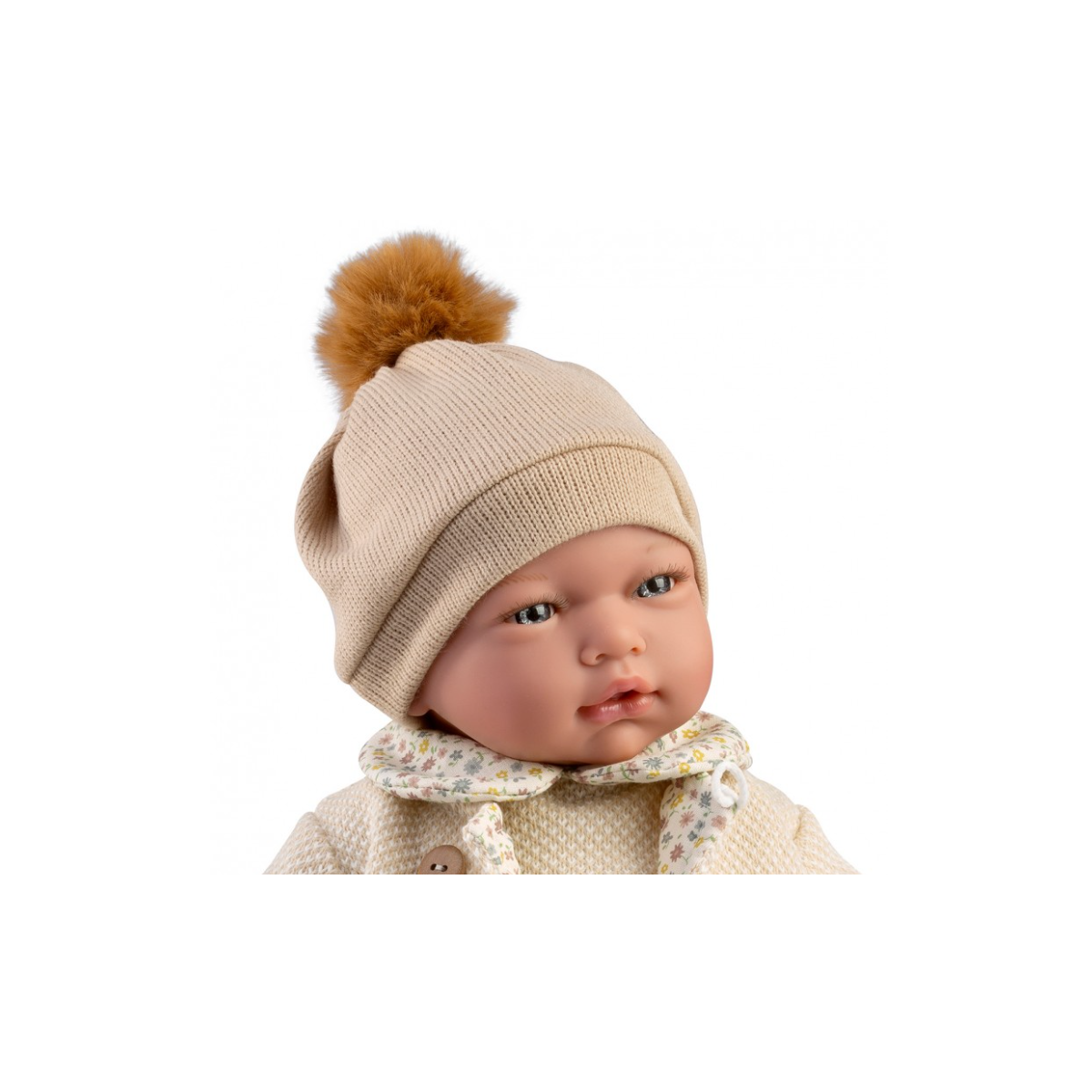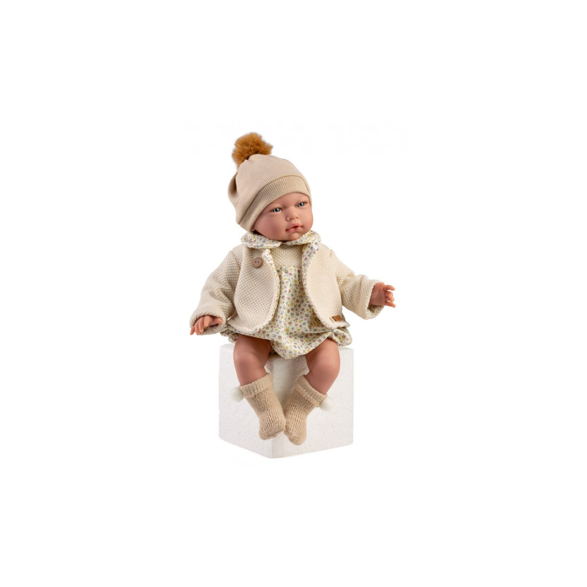 El conjunto que lleva puesto combina un pelele estampado de flores con una chaquetita de punto y un gorrito con pompón que le da un toque muy acogedor. El diseño está pensado para que manejala sea sencillo, permitiendo vestirla y desvestirla sin dificultad. Esta muñeca, por su tamaño y peso, invita a cuidar, acunar y simular rutinas cotidianas, lo que ayuda a desarrollar la empatía, la imitación y la capacidad de ponerse en el lugar de otra persona durante el juego.