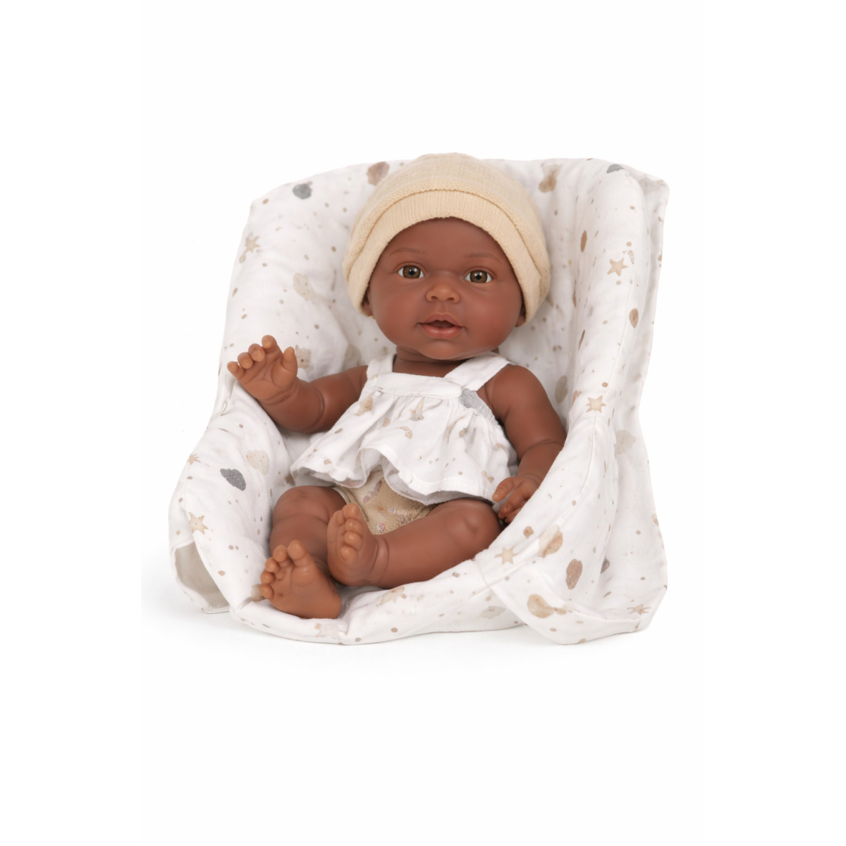 Este modelo de Muñecas Arias incluye ropita estampada y un práctico portabebé, que permite transportar al muñeco de forma cómoda y añadir más posibilidades al juego. Gracias a su cuerpo de vinilo, ofrece un tacto agradable y mayor realismo, haciendo que la experiencia sea aún más completa.