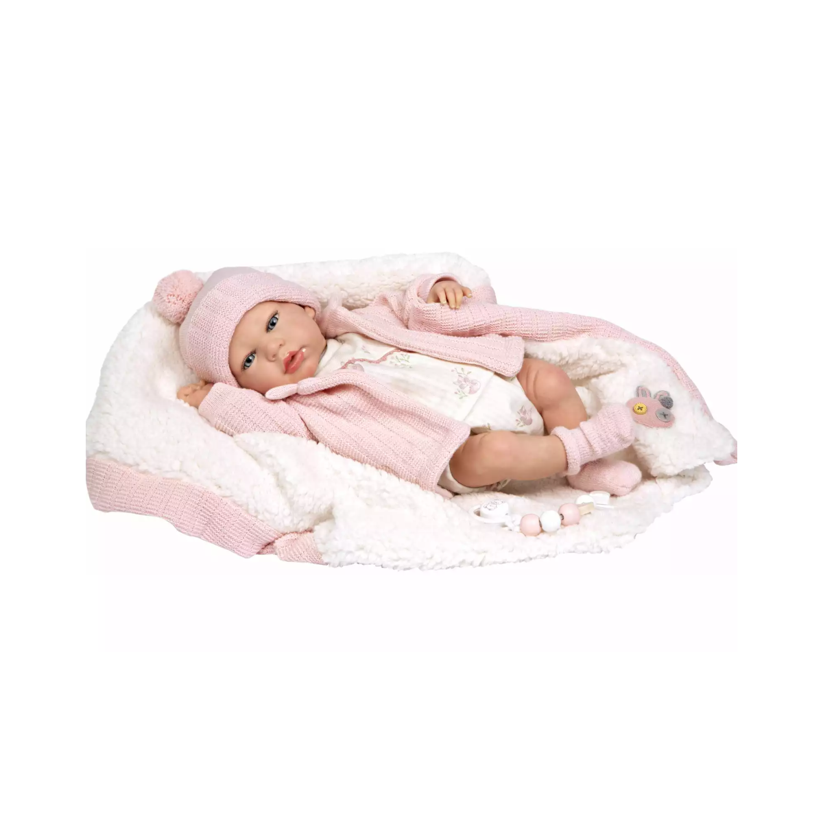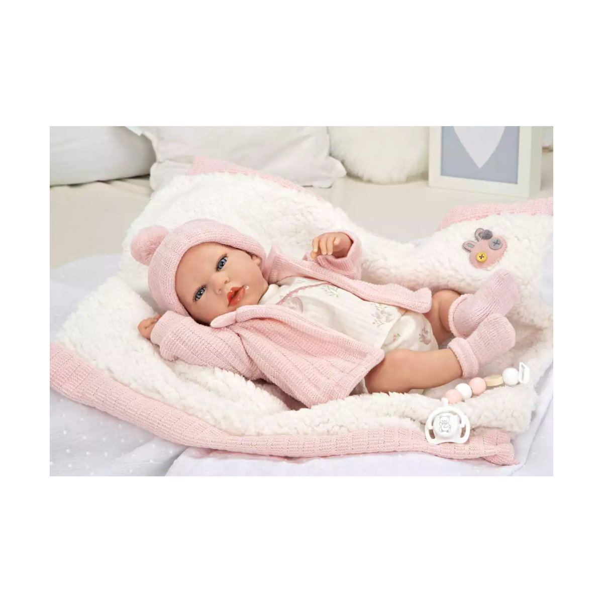 Vestida en tonos rosados y acompañada de una manta a juego, esta muñeca permite crear situaciones cotidianas como arroparla, dormirla o llevarla en brazos. Su tamaño intermedio facilita que resulte manejable, pero con suficiente presencia para aportar mayor realismo en cada momento de juego. Cada detalle está pensado para transmitir ternura y hacer que la experiencia sea más envolvente.
