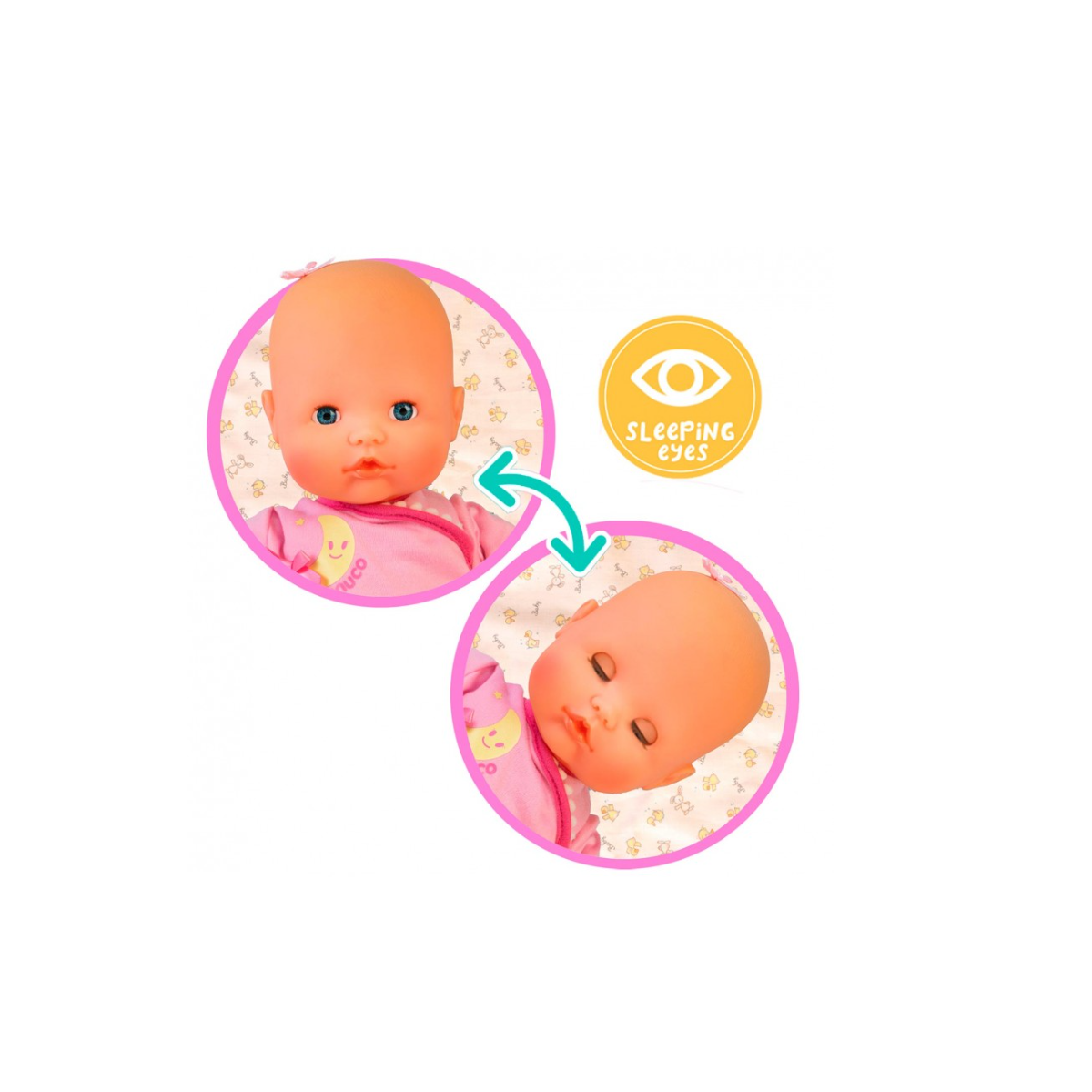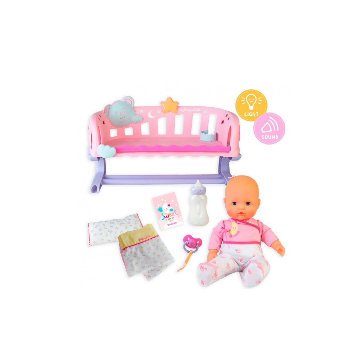 La marca Famosa garantiza que este juguete es seguro y duradero, perfecto para el juego tierno y las rutinas nocturnas de los más pequeños. El pack trae accesorios muy completos: un chupete y un biberón para cuidar a la muñeca, una mantita suave para abrigarla y una estrella luminosa que emite sonidos y luz para tranquilizar y acompañar al bebé hasta que concilie el sueño.