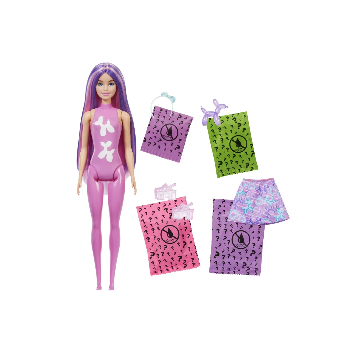 Al sumergir a Barbie Color Reveal Ciber Series Surtido en agua templada y girar el tubo, un efecto burbujeante revela poco a poco su look real: peinado, color de ojos y piel, ¡es una revelación total! Además, encontrarás dos paquetes sorpresa con una falda o shorts y un par de calzado (botas o patines). Una mascota mini y un accesorio sorpresa (como gorro orejas). Algunas ediciones incluyen cambio de color en el rostro con agua fría, lo que añade aún más magia.