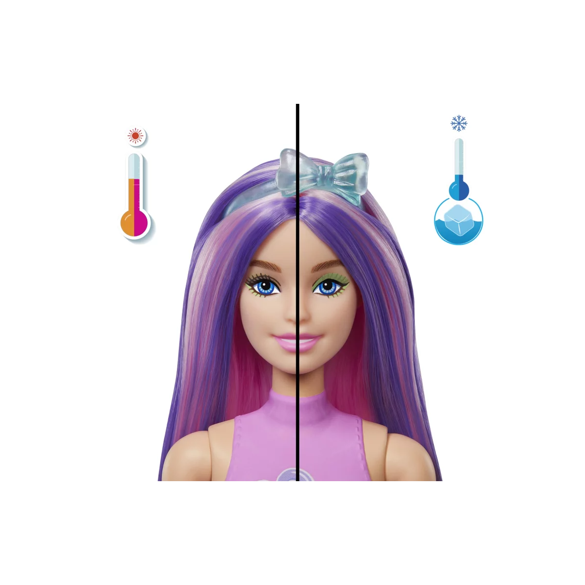 Prepárate para la experiencia sorpresa más divertida: esta Barbie llega dentro de un tubo, repleto con tu personaje favorito ¡y 6 sorpresas incluidas! Al abrir la tapa con orejas y quitar la lámina sellada con una pajita, descubrirás una deliciosa slime con aroma que acompaña todo el juego. Dentro, la muñeca está cubierta con una capa mágica de pintura rosa o metálica que cambia con agua caliente y fría.