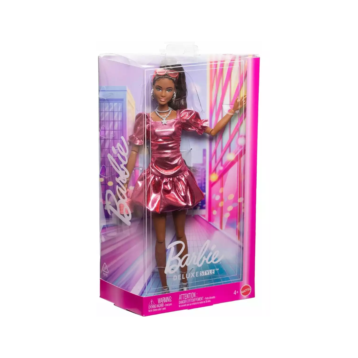 - Muñeca Barbie Deluxe Style con vestido metálico rosa de volantes tipo burbuja.