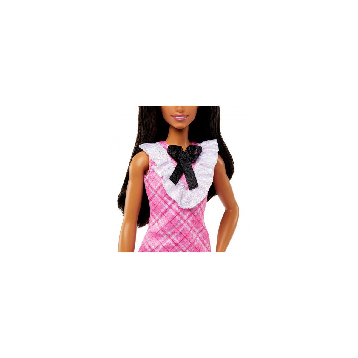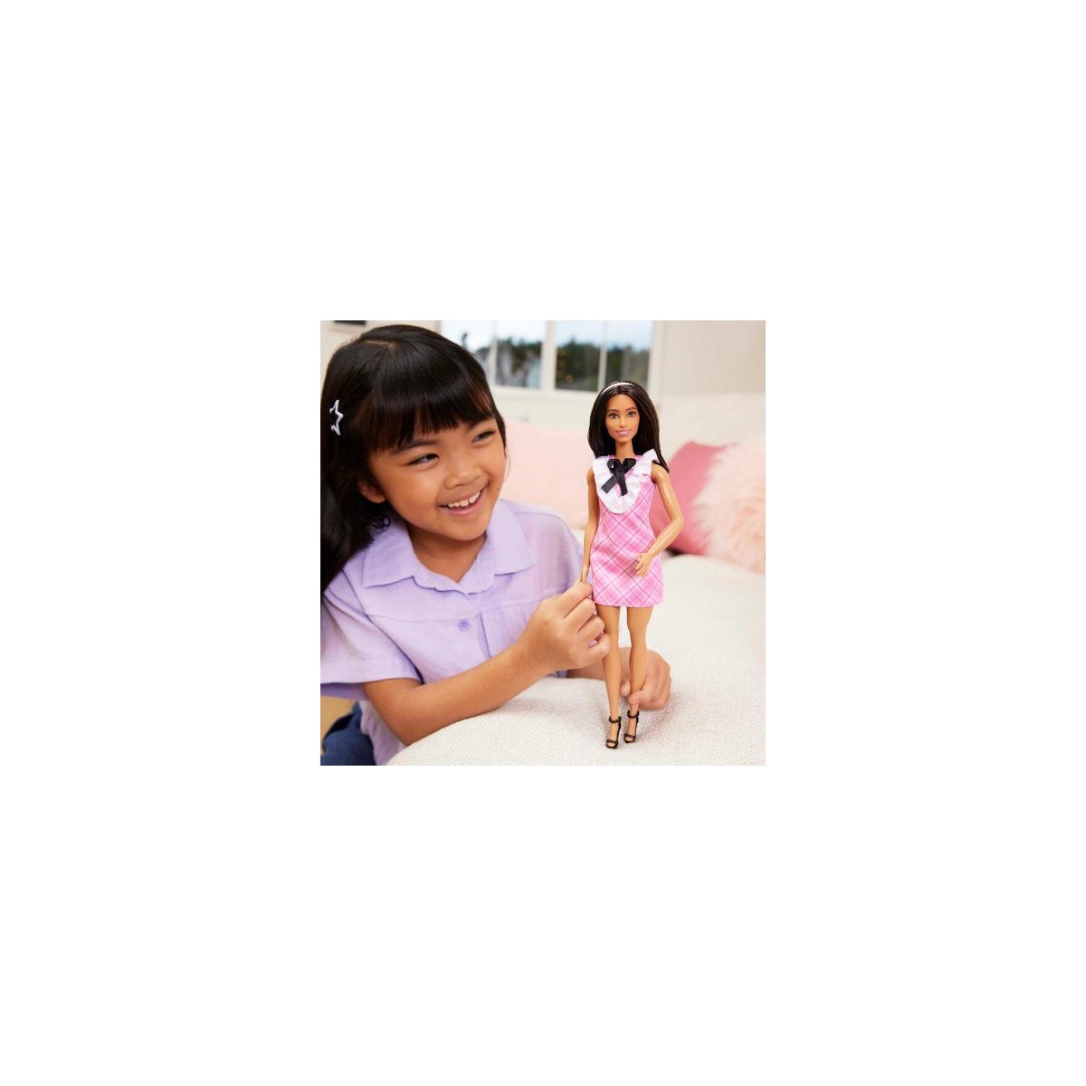 - Muñeca Barbie Fashionista con vestido de cuadros tartán en rosa.