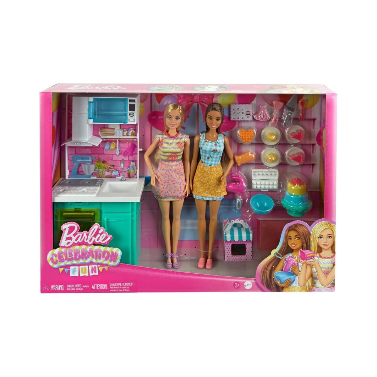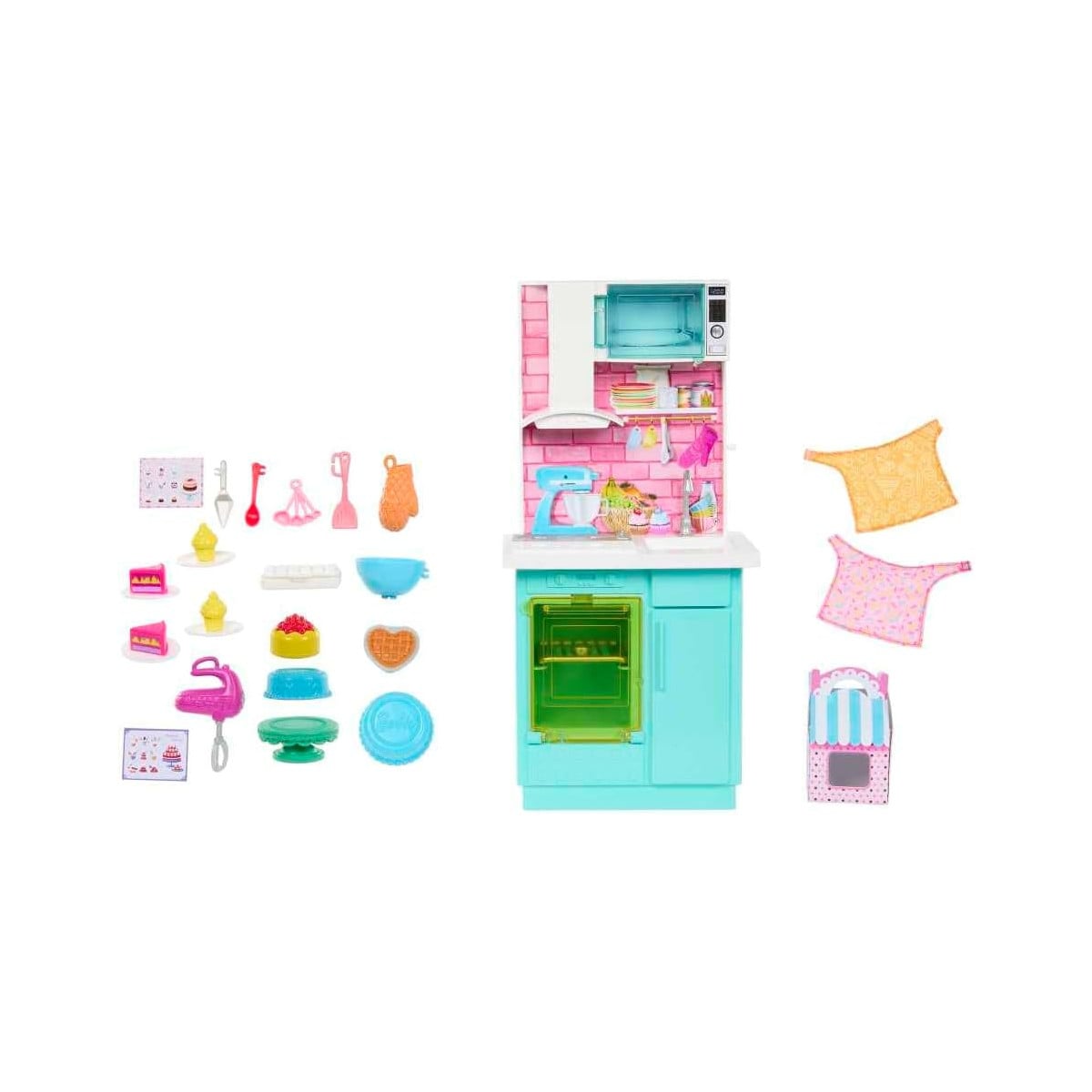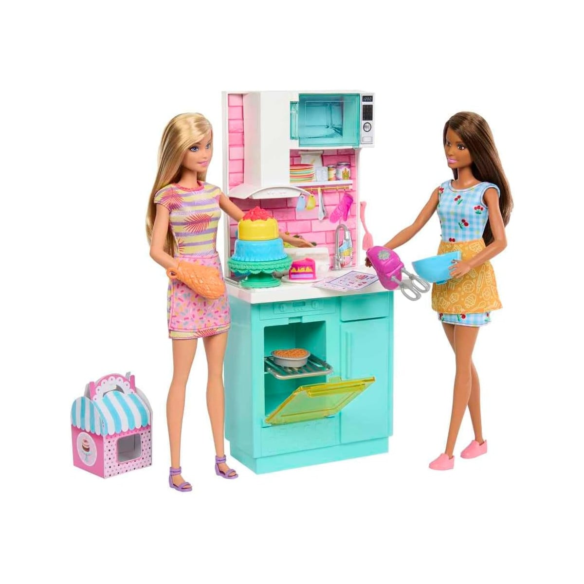 - Accesorios incluidos: 2 muñecas Barbie con outfits temáticos de cocina, más de 15 piezas entre cupcakes, tartas, utensilios de cocina, elementos de decoración y accesorios para preparar y servir postres.