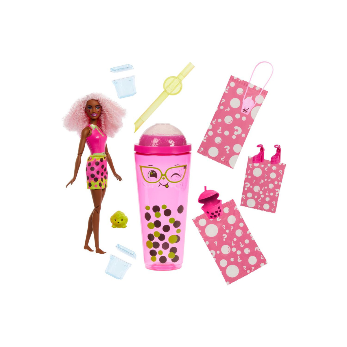 Contenido del set: Una muñeca Barbie, cápsulas efervescentes, y accesorios temáticos.