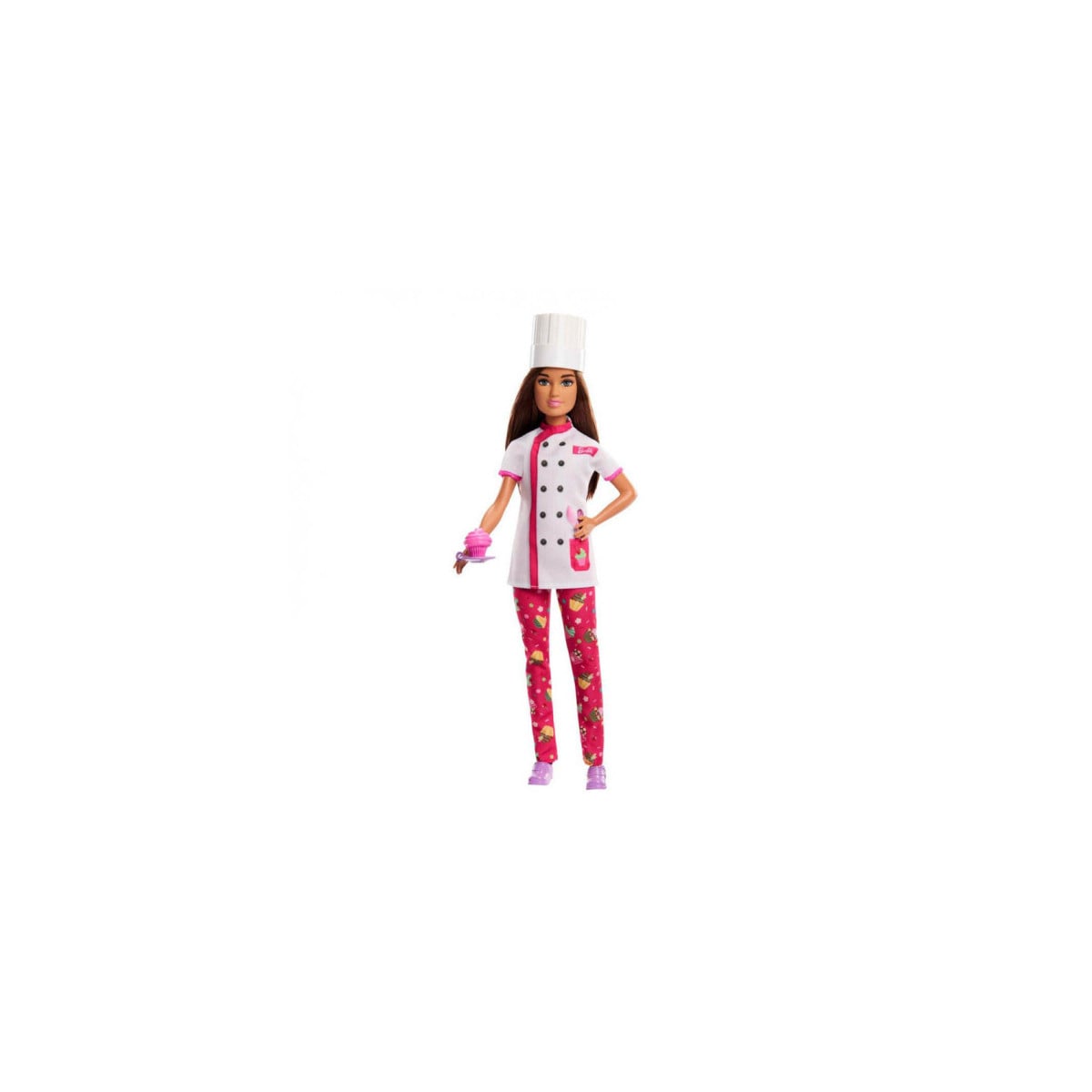 - Incluye: 1 muñeca Barbie con vestuario de pastelera, 1 cupcake y 1 gorro de cocina