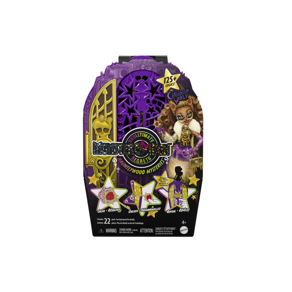 Clawdeen luce un look totalmente renovado, inspirado en el estilo Hauntlywood, con detalles góticos, telas brillantes y toques dorados que hacen de su conjunto uno de los más espectaculares hasta ahora. El set incluye no solo la muñeca, sino también una gran variedad de accesorios que giran en torno a la idea de descubrir pistas: llaves sorpresa, compartimentos ocultos y complementos con diseño temático.