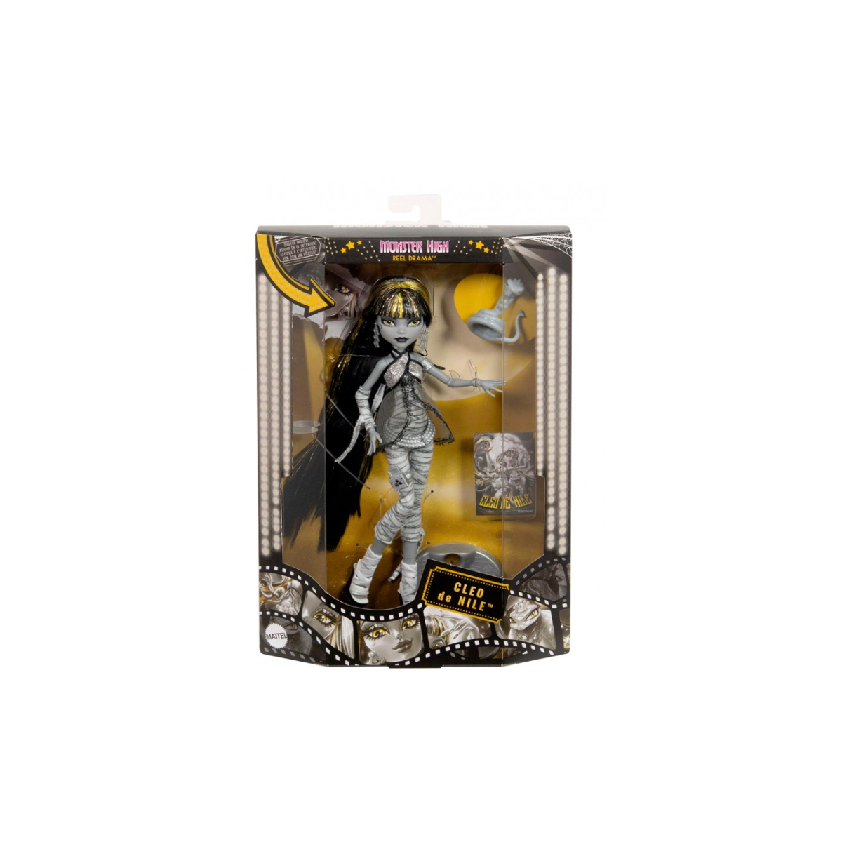 Descubre la Monster High Reel Drama Cleo De Nile; cabello dorado, serpiente Hissette, pósteres cinematográficos y estilo de coleccionista elegante.