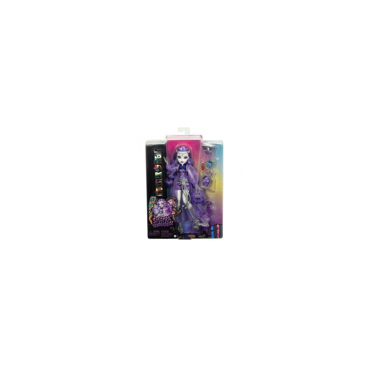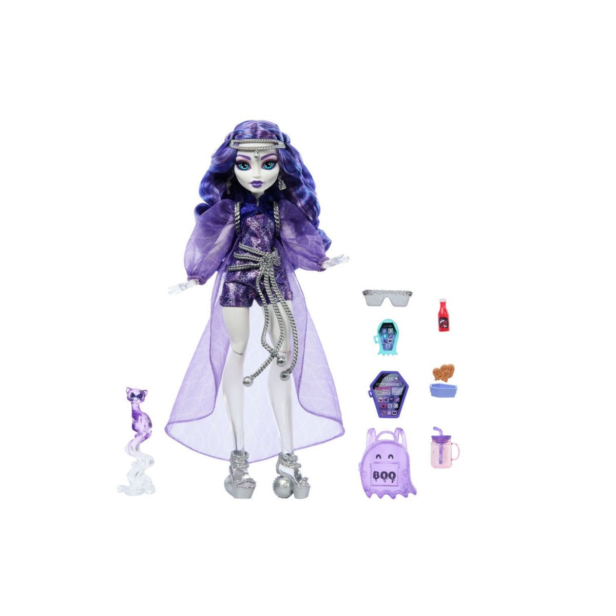 La muñeca Spectra tiene una estética única, con cabello largo de color púrpura y azul, y un atuendo moderno que refleja su estilo fantasmal. Además, lleva accesorios que complementan su aspecto elegante y sobrenatural. Su mascota, Rhuen, añade un toque encantador a esta figura, ya que también tiene detalles fantasiosos que lo hacen parecer parte del mundo espectral de Monster High.