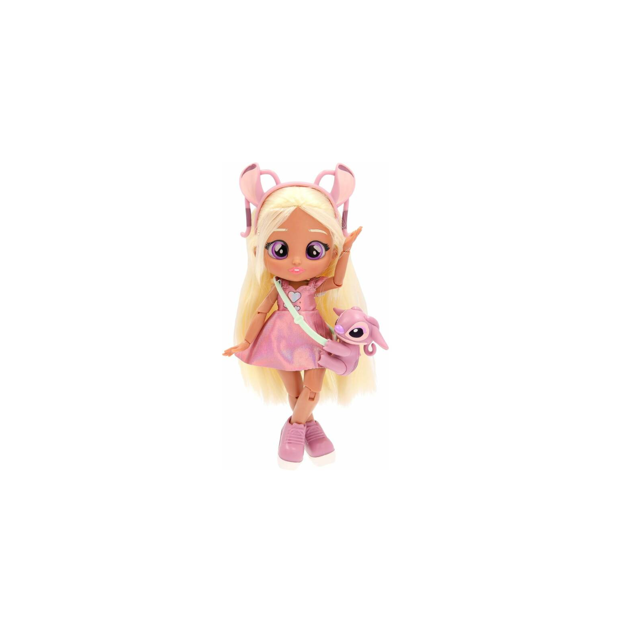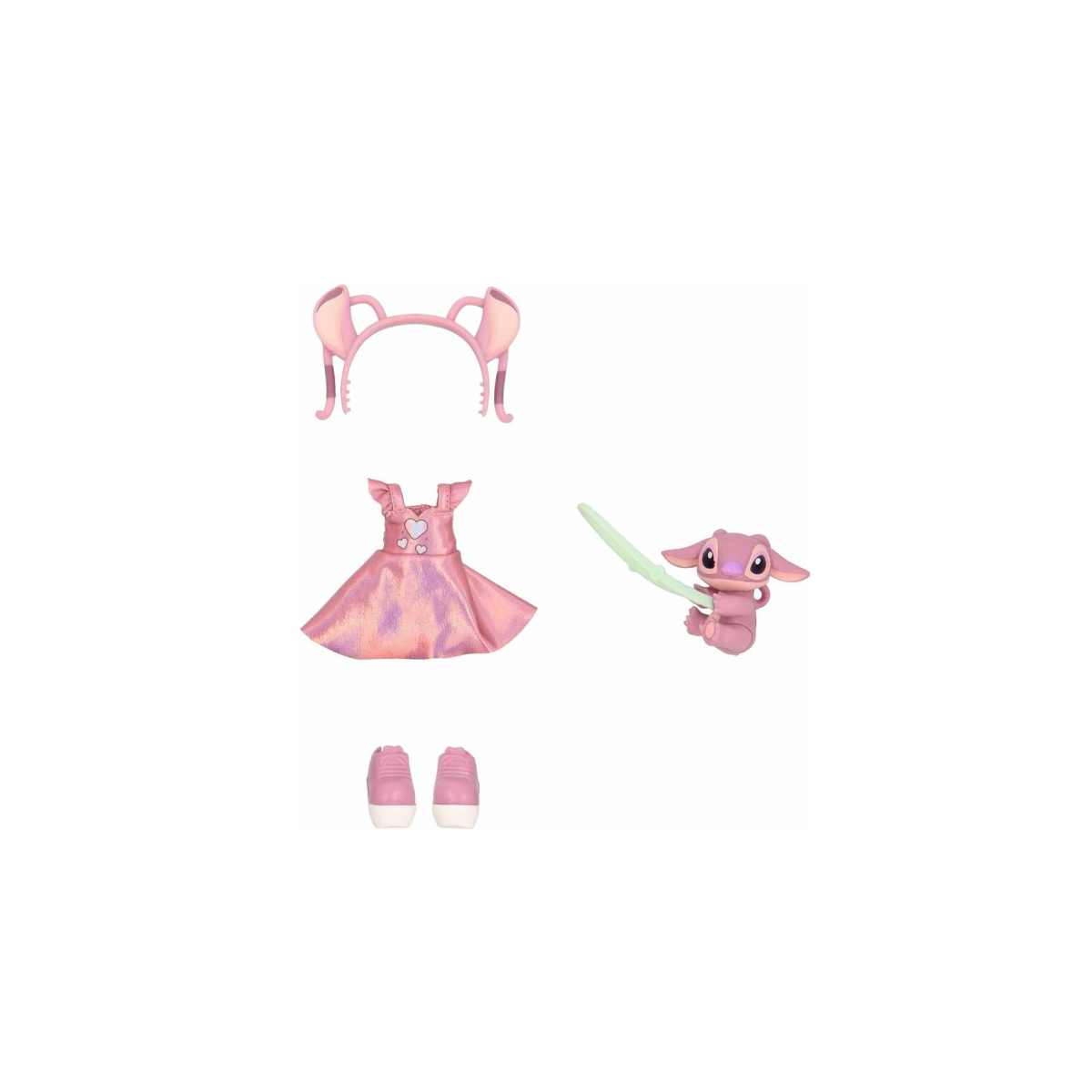 La muñeca lleva un precioso vestido rosa con detalles metalizados, unos zapatos a juego y una diadema con orejitas a juego que recuerdan al personaje original de Disney Stitch. Pero eso no es todo: también viene con un adorable bolso bandolera con la forma de su rostro, para completar el estilismo y acompañar cada aventura con un toque de diversión.
