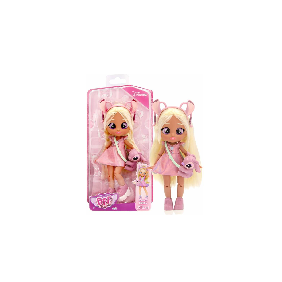 ¡Angel se apunta al estilo más brillante y divertido de todos! Esta muñeca articulada de la colección BFF de IMC Toys llega con un look inspirado en la inseparable amiga de Stitch. Con sus enormes ojos violetas, su melena rubia brillante y un outfit rosa lleno de corazones, Angel promete robar corazones allá donde va. Perfecta para las niñas y niños que adoran los looks llamativos, esta muñeca es un regalo lleno de personalidad y ternura.