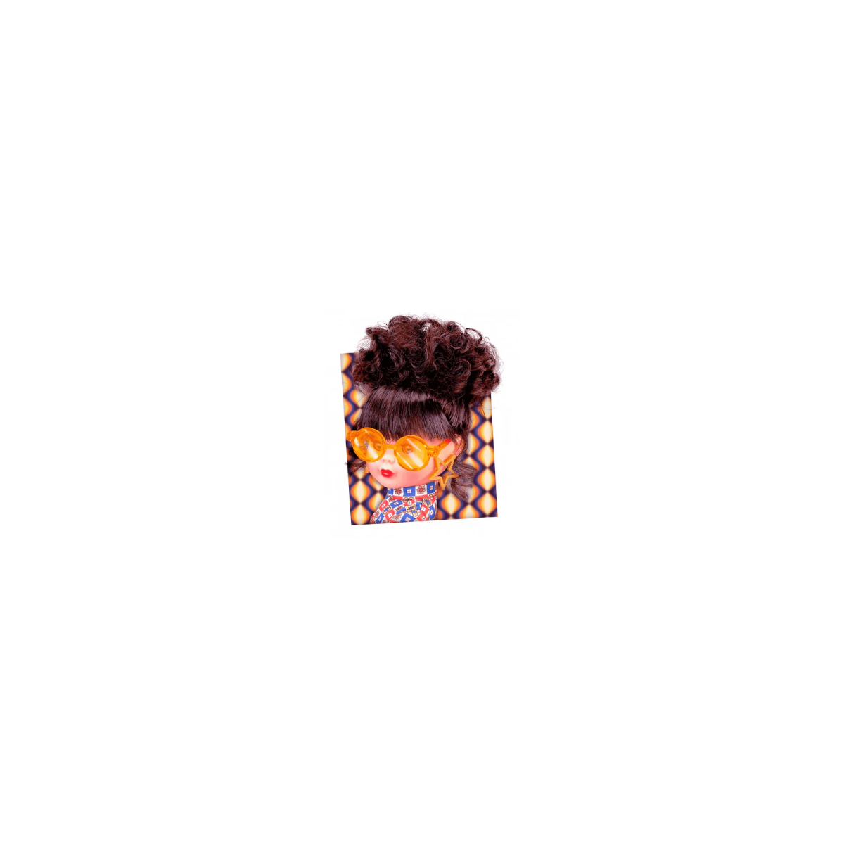 En esta reedición oficial de Nancy Loco Loco se mantiene el espíritu del diseño original, incorporando un blusón estampado con motivos geométricos al más puro estilo retro y unos pantalones de pata de elefante en tono marrón que completan el conjunto setentero. También incluye un cinturón naranja con flecos que aporta movimiento y un aire muy distintivo. La muñeca mantiene su característica personalidad marcada por un peinado voluminoso: una coleta alta llena de rizos que contrasta con su flequillo recto, reflejando a la perfección la estética de la época. Además, luce accesorios icónicos como grandes pendientes dorados en forma de estrella y unas gafas redondas translúcidas de color naranja que refuerzan aún más su toque retro.