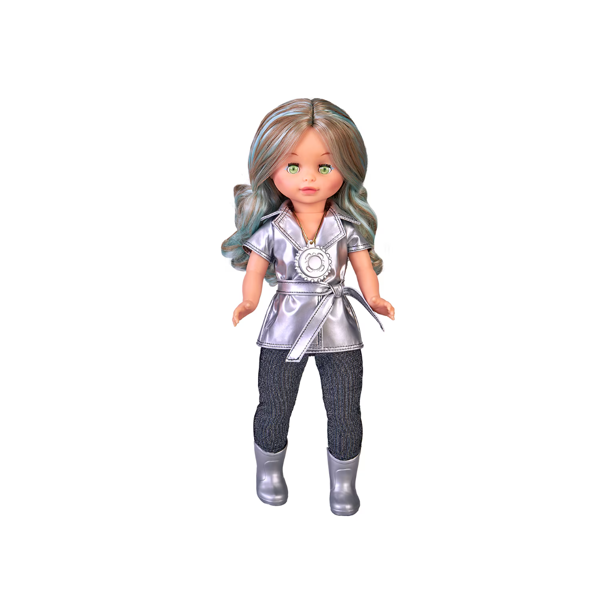 En esta presentación oficial de Nancy Colección Selene se mantiene la esencia del diseño original, adaptándolo con acabados actuales que realzan aún más su personalidad. Su melena larga ondulada con mechones azulados aporta un aire etéreo y luminoso, mientras que su conjunto plateado, compuesto por una chaqueta de efecto metalizado, cinturón a juego y leggings brillantes, crea un look completamente espacial. El colgante circular dorado es un elemento clave del modelo: al activarlo, sus ojos proyectan destellos verdes que simulan mensajes intergalácticos, añadiendo una función interactiva que encanta tanto a peques como a coleccionistas.
