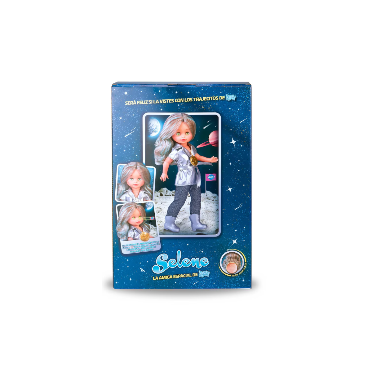 La muñeca está diseñada con un estilo elegante y futurista que combina a la perfección con el fondo temático de su caja, donde aparecen planetas, estrellas y escenas espaciales que envuelven a Selene en un ambiente mágico. Su reedición certificada incluye número de serie, convirtiéndola en una pieza ideal para quienes siguen las colecciones anuales de Nancy. Además de su valor coleccionista, Selene es una opción maravillosa para niñas y niños mayores de 6 años, que pueden disfrutar inventando historias de ciencia ficción, aventuras galácticas o juegos ambientados en otros planetas. Su presencia, su brillo y su estética hacen que sea una muñeca que destaca siempre.