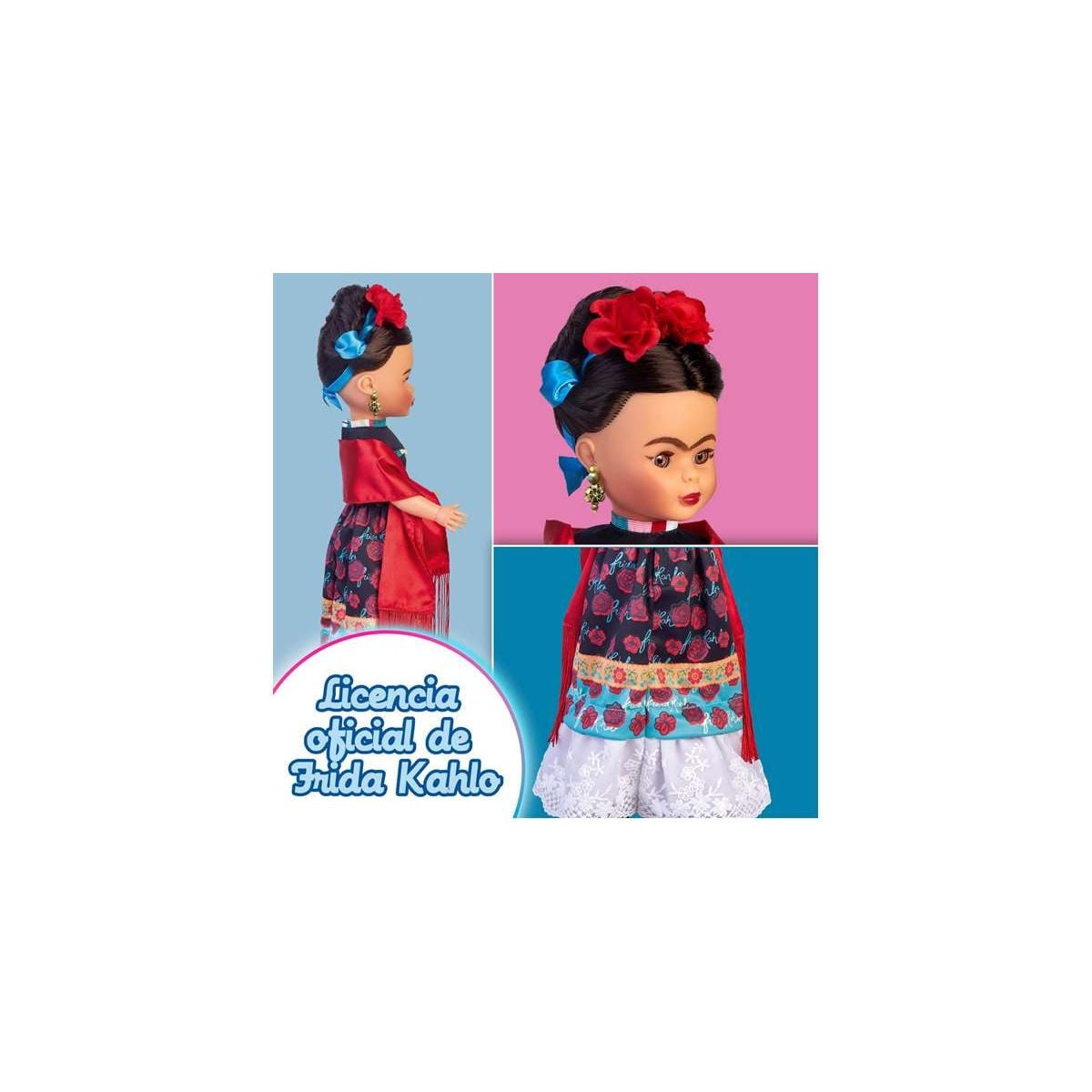 La "Muñeca Nancy Colección Frida Kahlo" celebra el arte y estilo único de Frida con detalles auténticos y un folleto educativo, ideal para coleccionistas y fans.