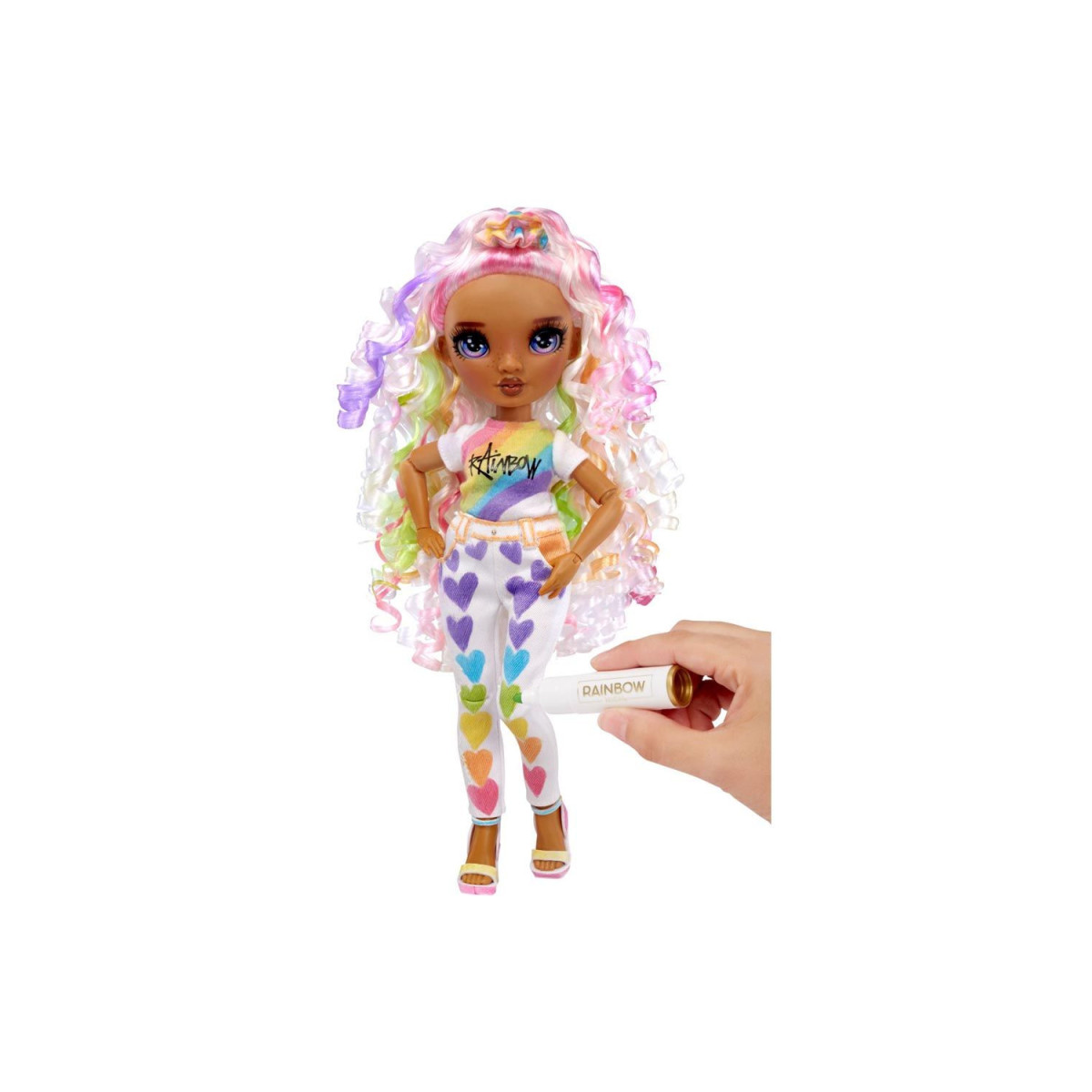 El set incluye seis rotuladores de colores lavables, prendas intercambiables, zapatos, accesorios y un peine para cuidar su melena. Todo está pensado para fomentar la creatividad, la autoexpresión y el juego libre, convirtiéndose en un regalo perfecto para quienes disfrutan inventando, creando y transformando a su muñeca en una auténtica modelo Rainbow High.