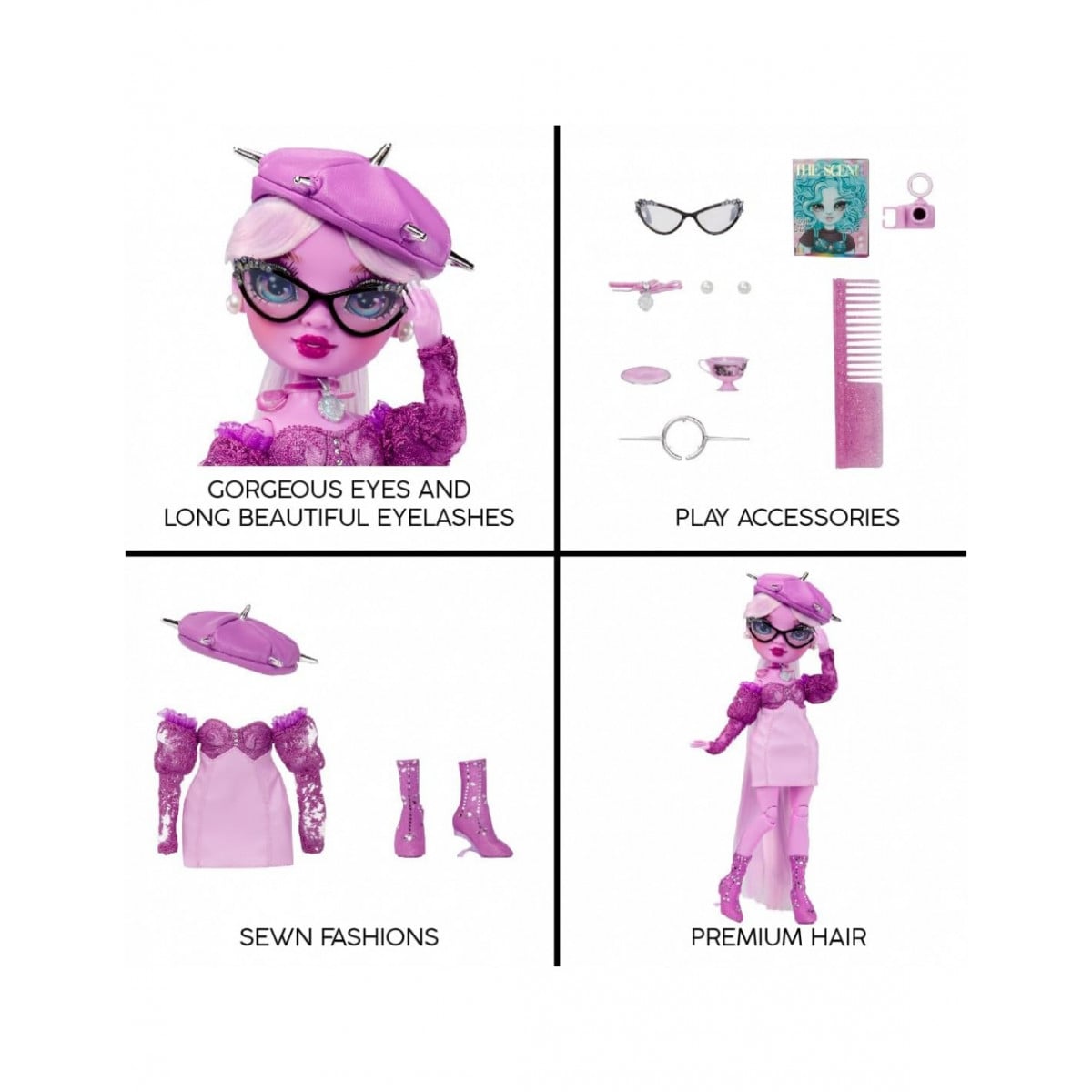Nadie representa mejor el color morado que Lavender Lynne, con su vestido corto entallado, sus botas de tachuelas y su boina a juego Lavender tiene un estilo único. Descubre a las Rainbow High y llénate de color.