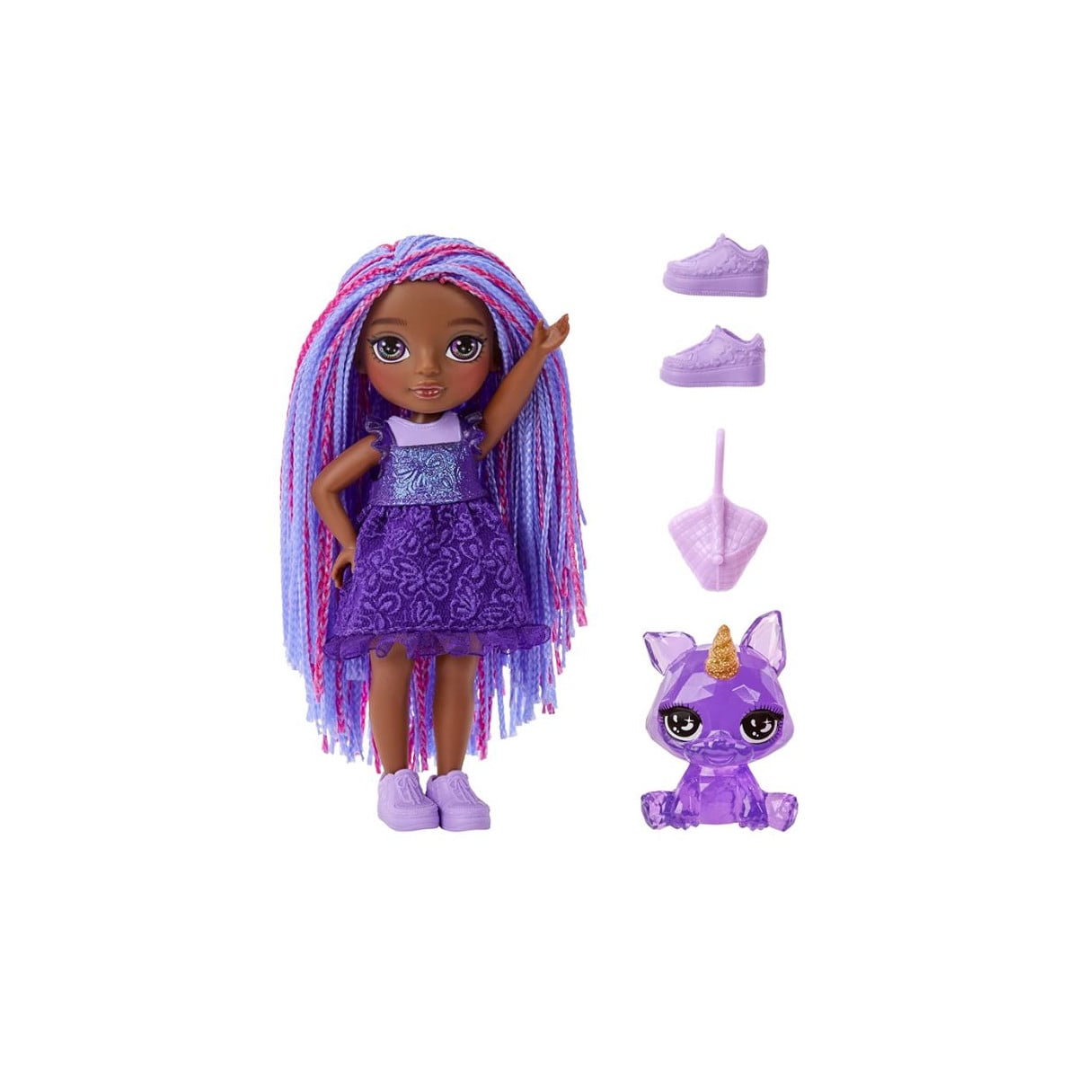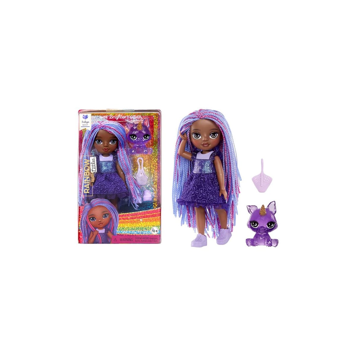 Te presentamos a Indigo, la nueva muñeca Rainbow High Little Doll. Mide 14 cm y viene acompañada de su inseparable mascota, su bolso y sus zapatos.