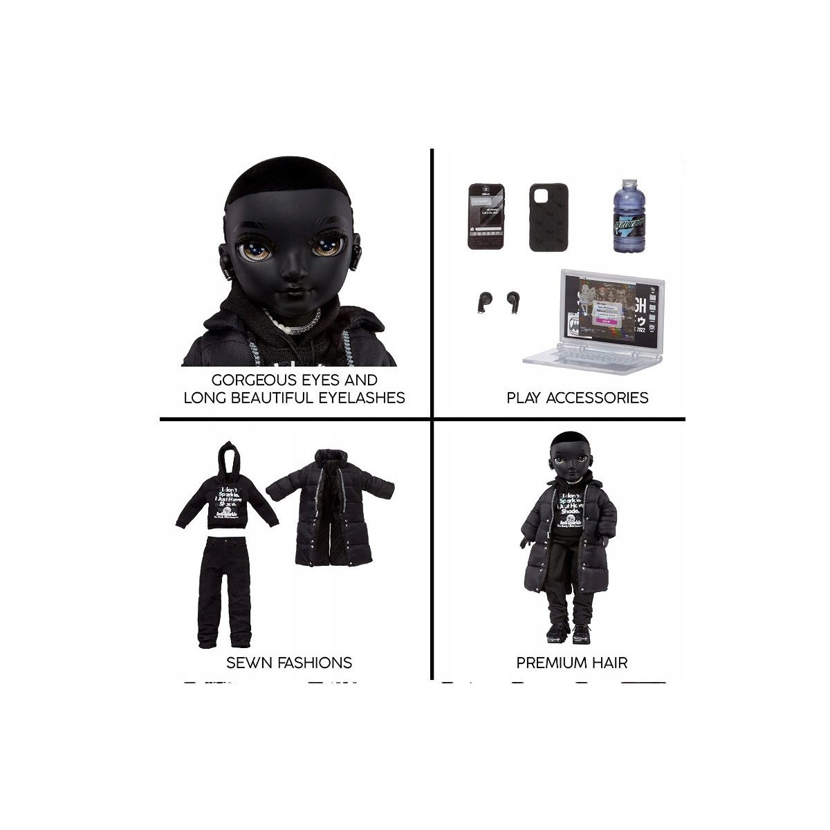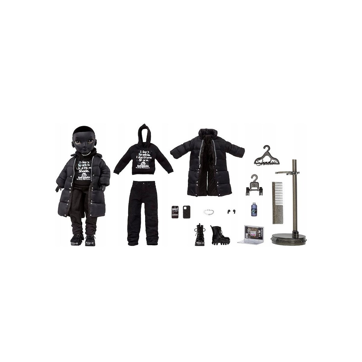 Incluye 1 muñeco Rainbow High S23 Rexx McQueen, 1 sudadera, 1 pantalón, 1 abrigo, 1 móvil, 2 auriculares, 1 par de botas, 1 pulsera, 1 botella, 1 portátil, 1 peine, 2 perchas y 1 soporte
