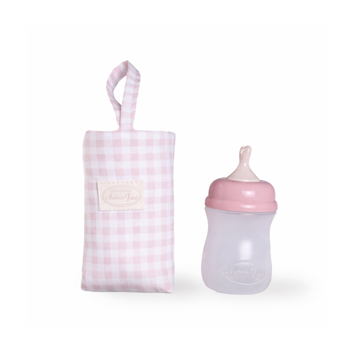 - Materiales: Tela Vichy rosa de calidad combinada con biberón de plástico seguro, resistente y adecuado para el uso infantil.