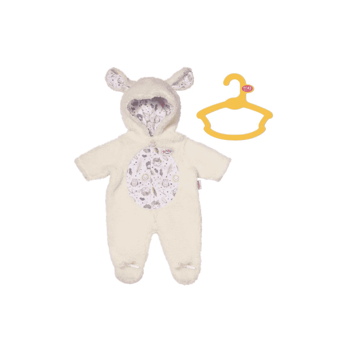 Pijama Baby Born ovejita para muñecos de 43 cm con tejido suave, capucha con orejas y diseño adorable, ideal para completar el juego simbólico y recrear momentos de cuidado.