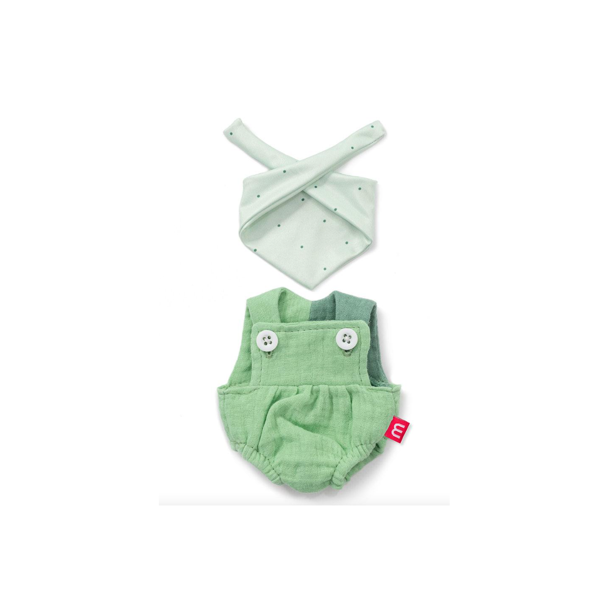 Este set incluye un peto verde con un diseño cómodo y moderno y un pañuelo a juego, ideal para completar el look. Gracias a su confección en tejidos suaves y resistentes, el conjunto es fácil de poner y quitar, fomentando la autonomía y la motricidad fina en los niños y niñas.