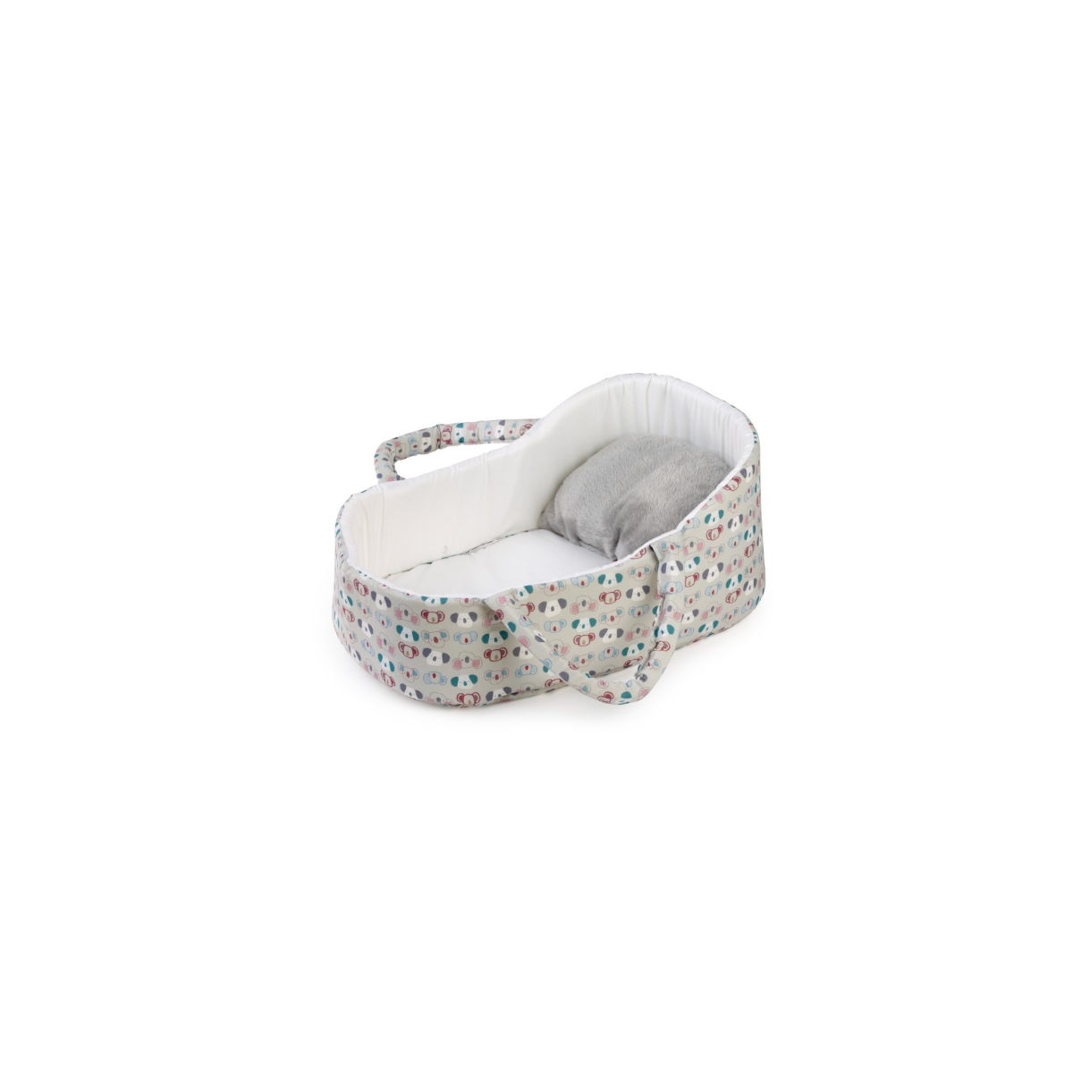 Este modelo presenta un diseño en tonos grises suaves que le da un estilo más neutro y moderno, ideal para combinar con cualquier conjunto o accesorio. Su estructura acolchada y su interior confortable proporcionan un espacio seguro para el muñeco, mientras que las asas facilitan su transporte de manera sencilla.