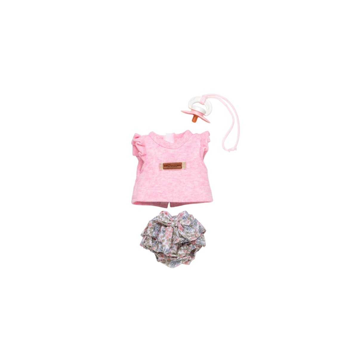 Este conjunto de Muñecas Guca incluye una camiseta de manga corta en tono rosa y unas braguitas con estampado floral, creando una combinación suave y muy cuidada. Además, incorpora un chupete como accesorio, añadiendo un detalle extra que completa el conjunto y refuerza el realismo en el juego con muñecas.
