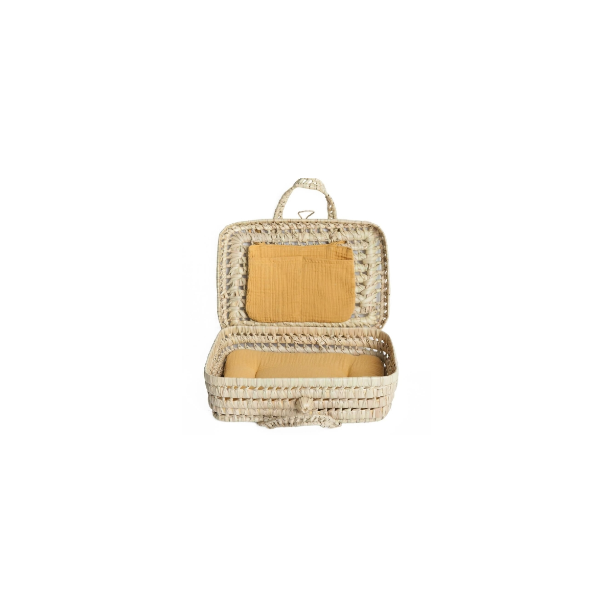 Por dentro, esta Maleta Mimbre Bobble Mostaza ofrece espacio suficiente para transportar a la muñeca preferida y todos sus accesorios: desde ropita hasta biberones, pequeños peluches o cualquier objeto que forme parte de su rutina de juego. Todo queda bien guardado gracias a su cremallera envolvente y los compartimentos interiores pensados para mantener el orden.